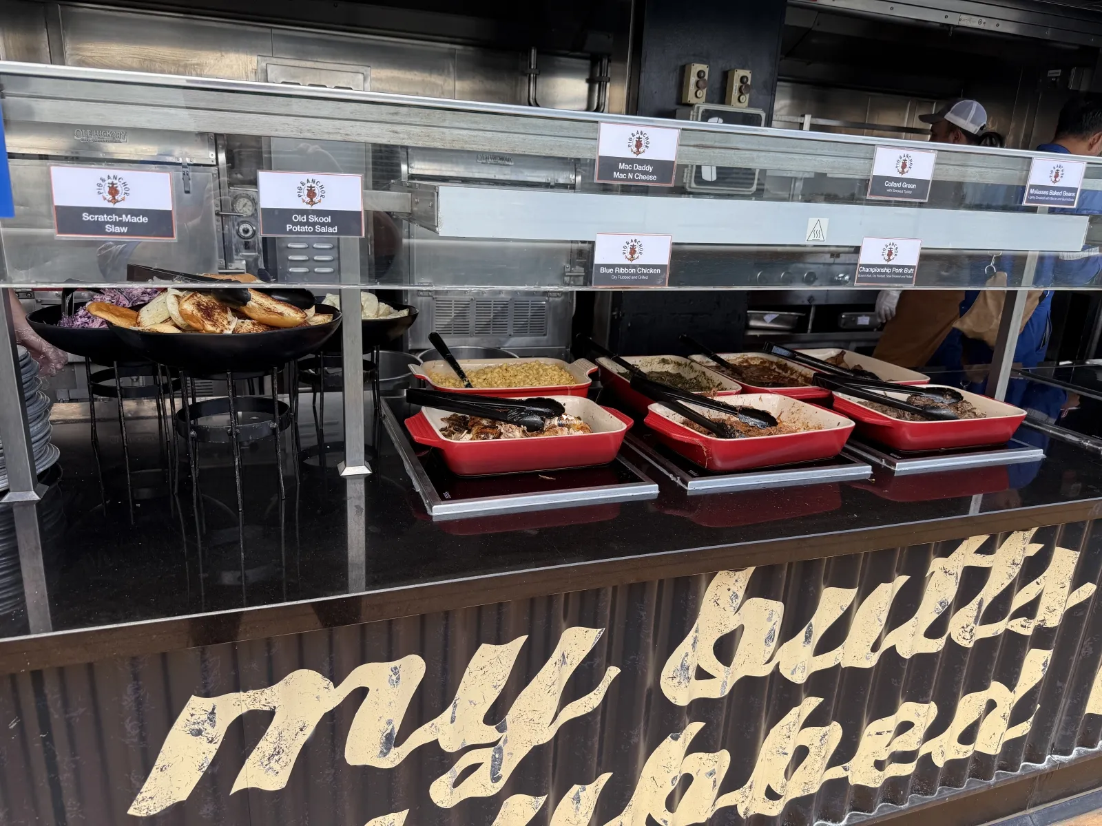 Hours: 12:00pm-2:30pm on sea days. Complimentary. Guys Pig & Anchor Bar-b-que Smokehouse. Includes menu items such as Championship Pork Butt, Smoked Andouille Sausage, and Guys famous Blue Ribbon Chicken; as well as sides like Mac Daddy Mac 'n Cheese and Old Skool Potato Salad. Top it all off with Guys line of signature barbecue sauces.Cabin Check Tool