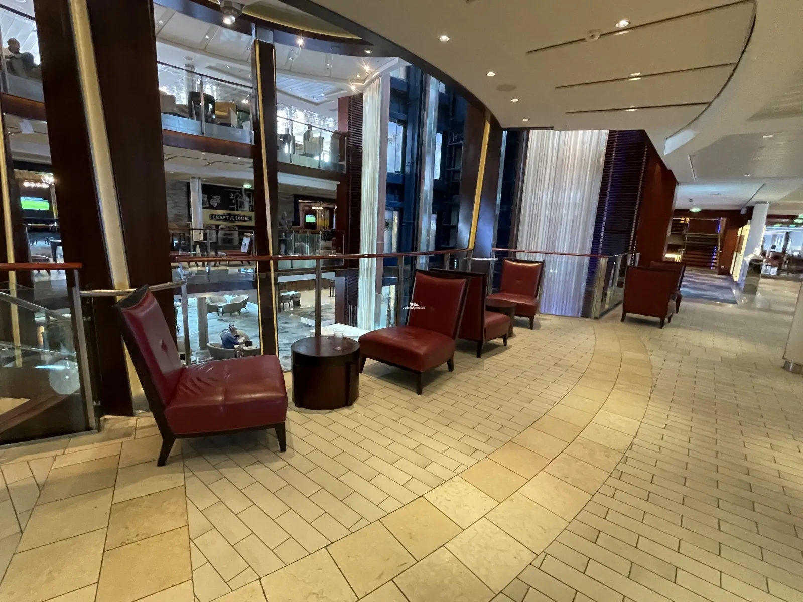 Atrium that spans mulitple decks. On first level you will find Passport Bar, Shore Excursions and Guest Relations with plenty of lounge chairs.Cabin Check Tool