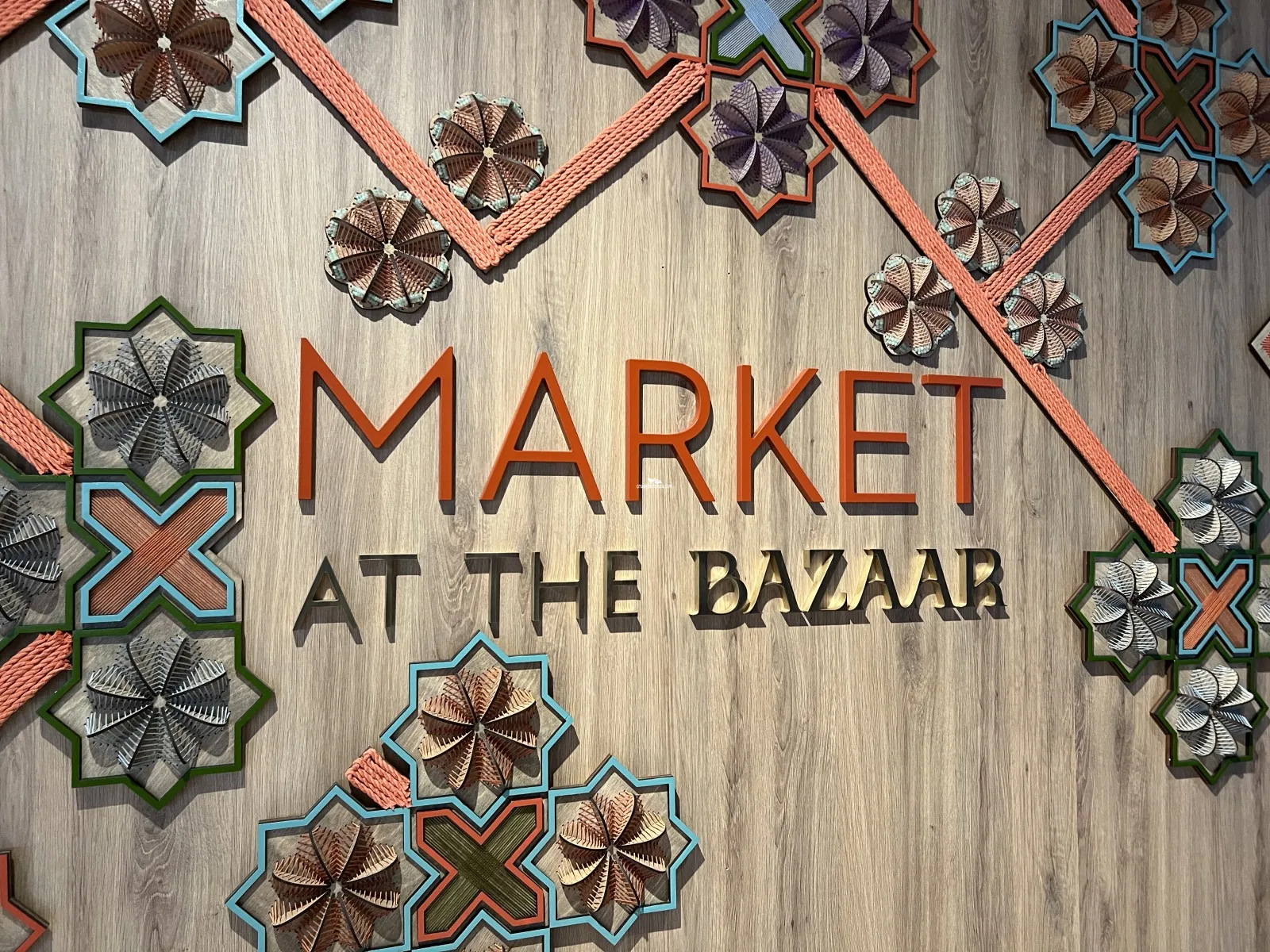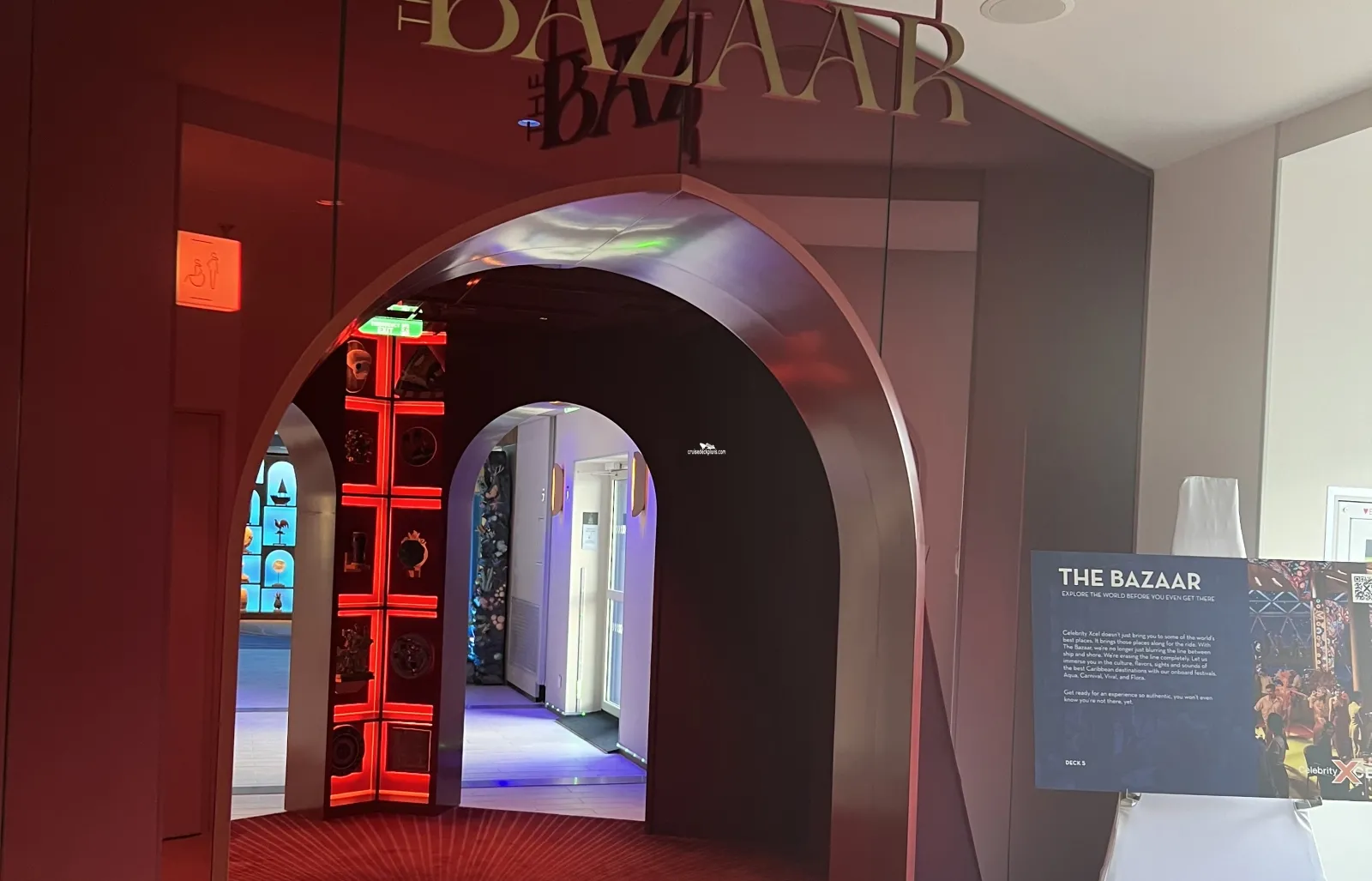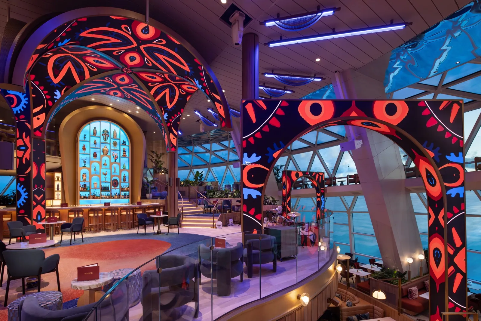 Two story lounge area with food, drinks, entertainment and large windows overlooking wake of ship. There is a panoramic walkway between the two levels.Market at the Bazaar