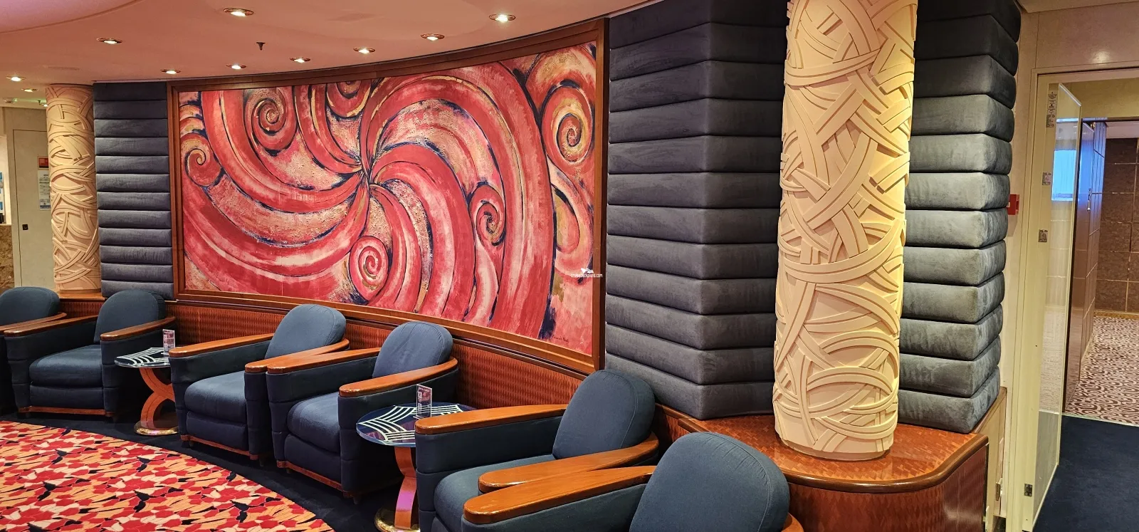 Three story main atrium. On first level is reception desk and bar with lounge area with seating for 62 guests.Cabin Check Tool