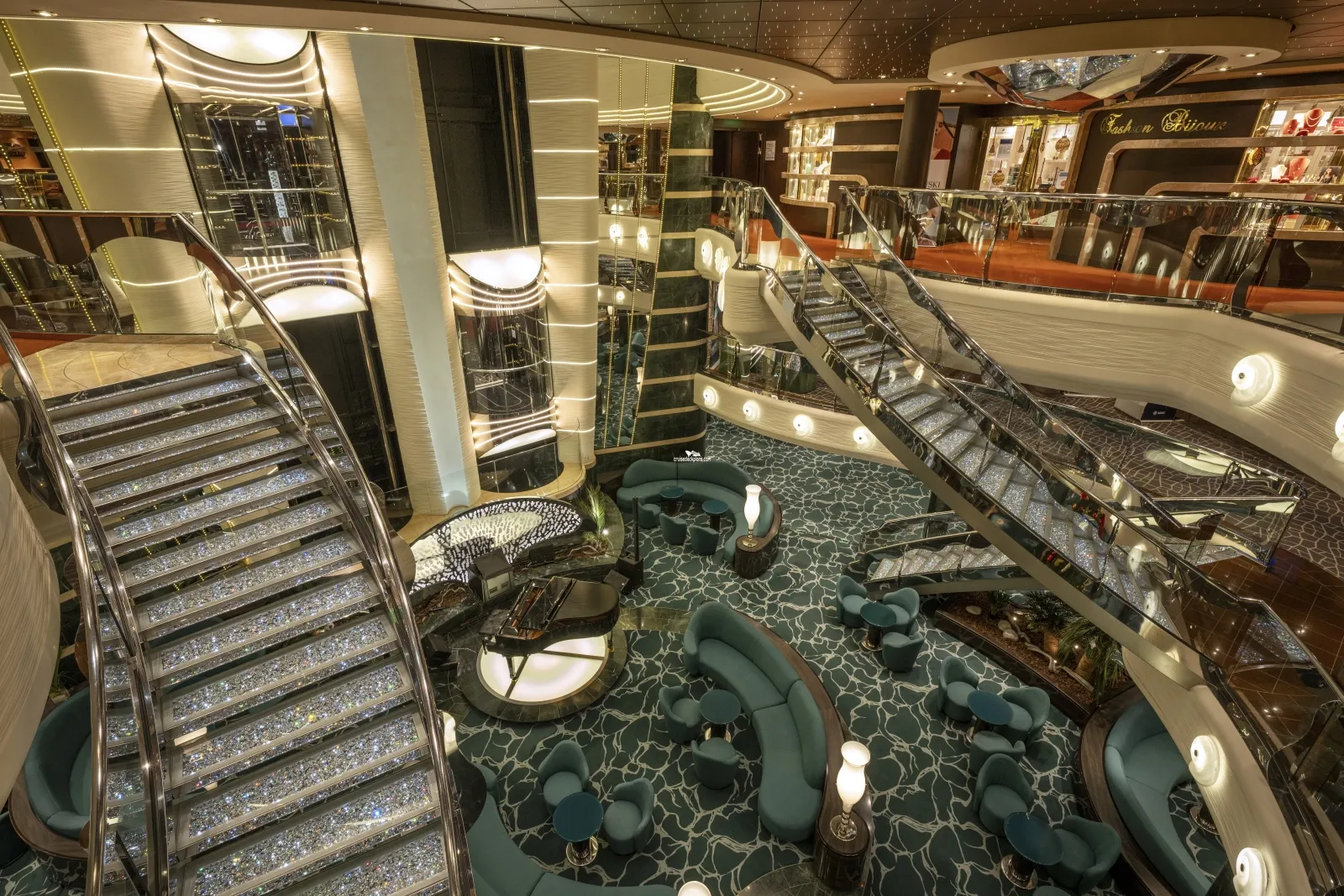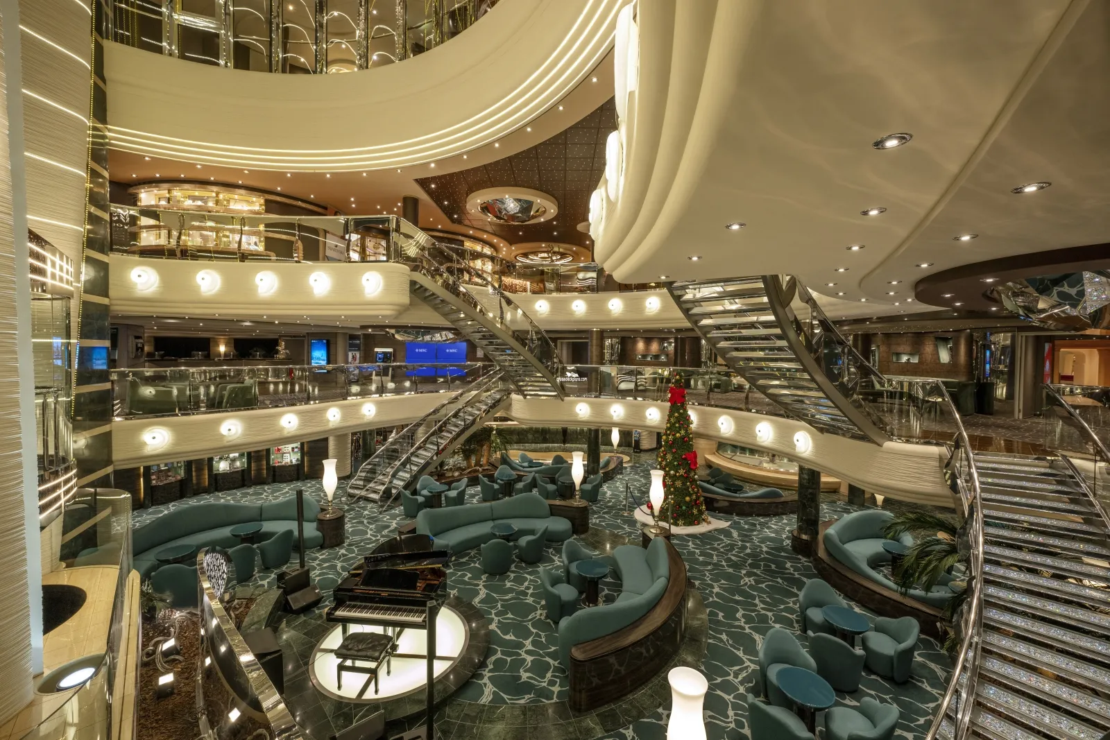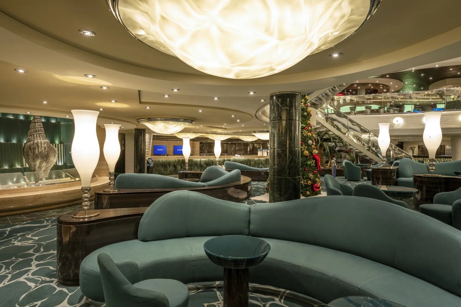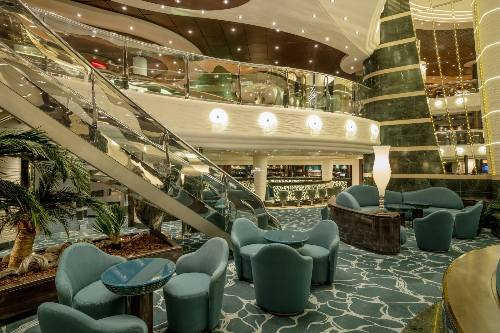 The ships atrium. On first level is guest services desk, bar and lounge with seating for 93 people.Cabin Check Tool