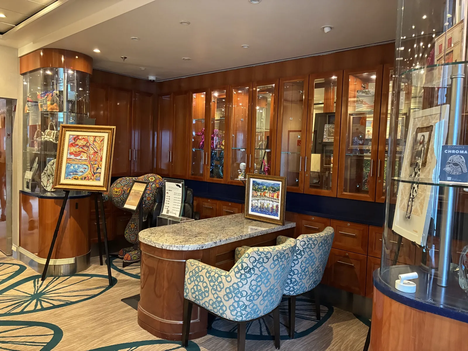 The place to visit to view all the photos taken by the ship's on board photographer and purchase one if so desired, or get a portrait taken with different backgrounds to choose from. A range of digital cameras and accessories are also available for sale.Soho Art Gallery