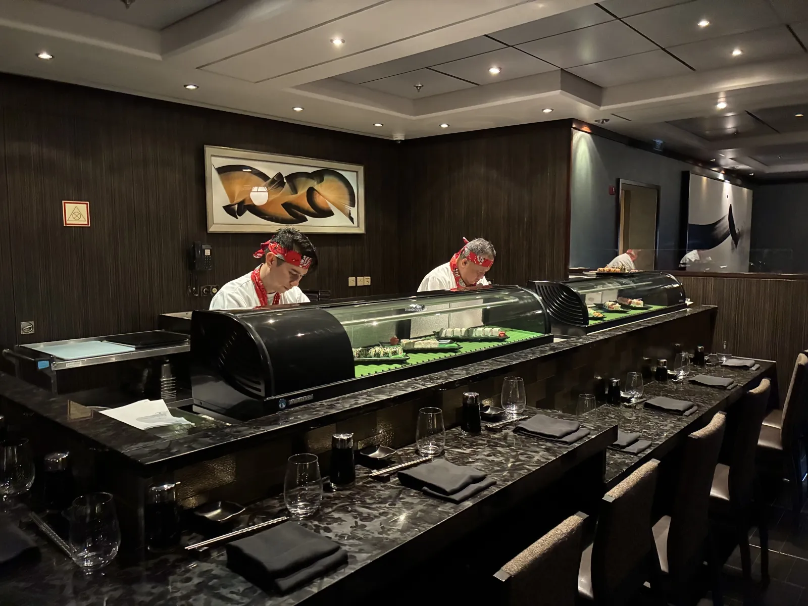 Opens for dinner with seating's at 5.30pm, 7.30pm and 9.30pm, and invites 8 guests per table to sit around the central cooking area for an Asian dining experience where they watch the chefs show off their skills slicing and dicing whilst preparing meat, poultry, fish and vegetables on an iron griddle.Sushi Bar
