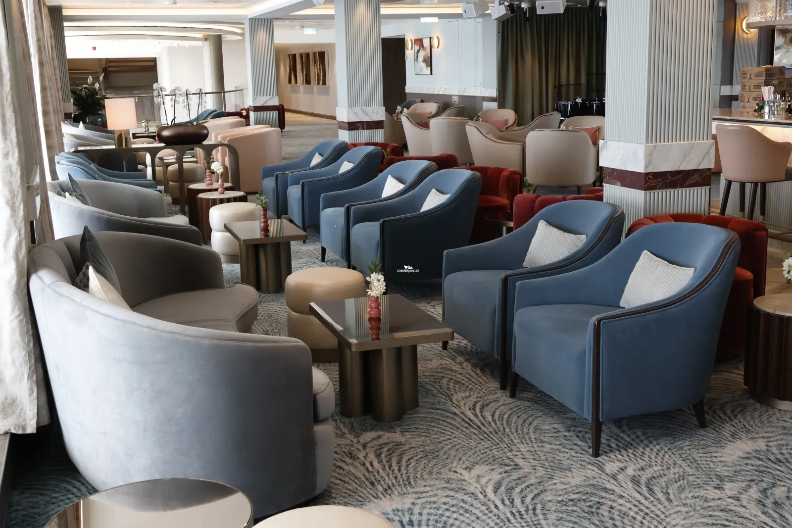 Two deck high lounge featuring the grandeur and magic of music and theatre. The experience of being transported by performance. A place where the arts of theatre and music meet with full-scale productions and feature films. Belle-epoque style cabaret seating, with intimate tables and chairs subtly placed between the rows of comfortable tiered banquettes.Atrium
