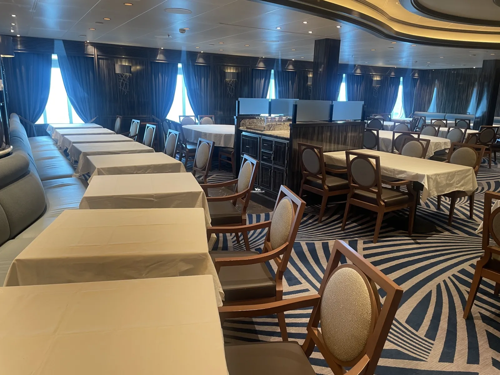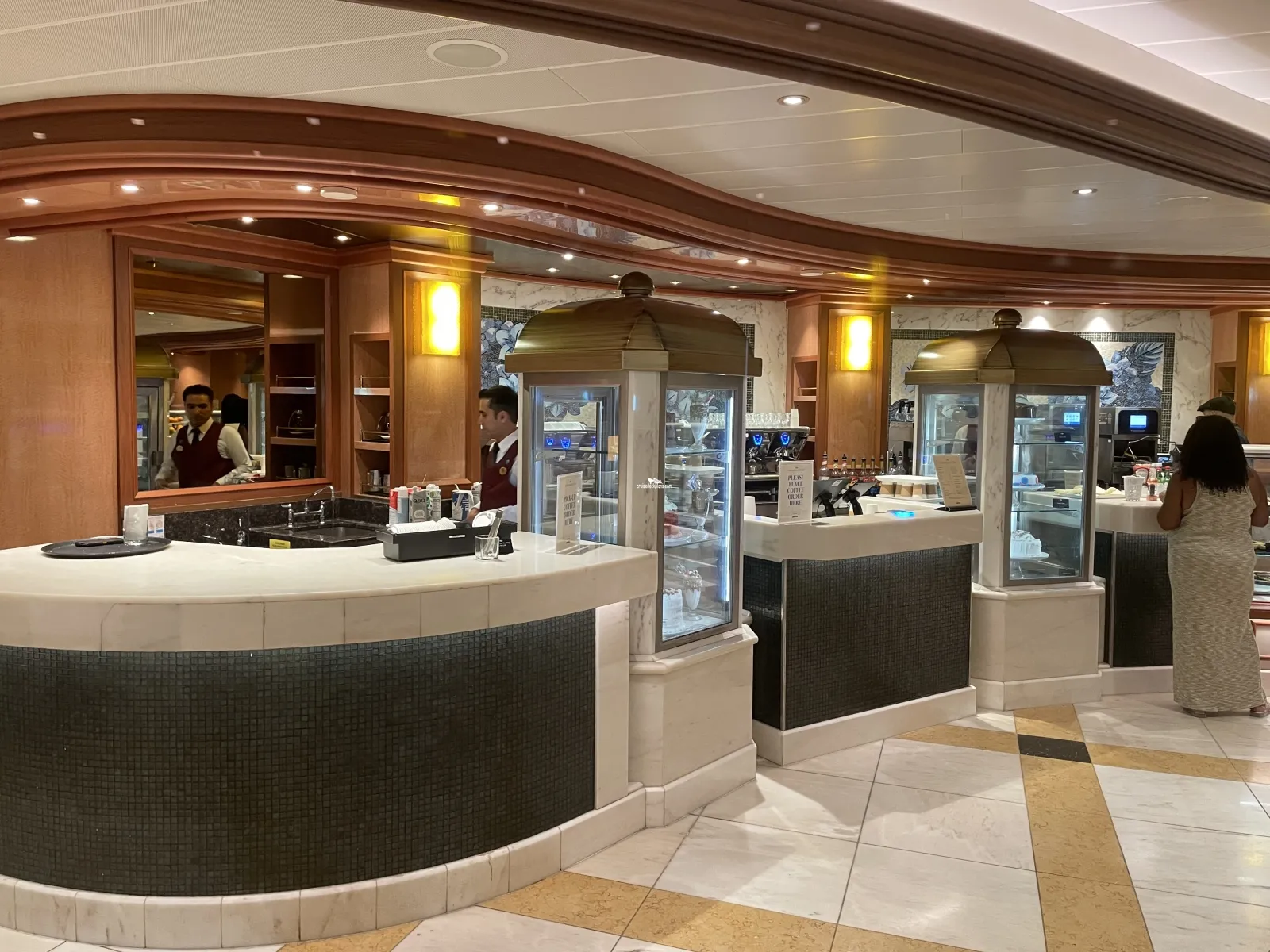One of the Royal Princess' three main dining rooms and features its "anytime" dining plan where guests can dine when, where and with whom they wish. The room also features a circular wine cellar where up to 12 passengers can enjoy a private dining experience surrounded by shelves full of wine.International Cafe