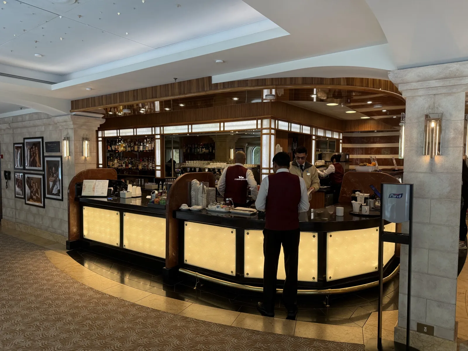 Ships atrium. On first level is passenger services, shore excursions, future cruise sales, circle desk (loyalty desk), and a lounge area.Ocean Front