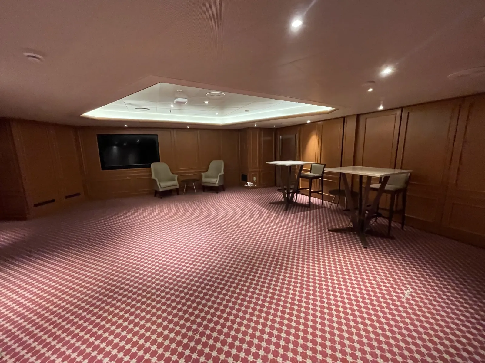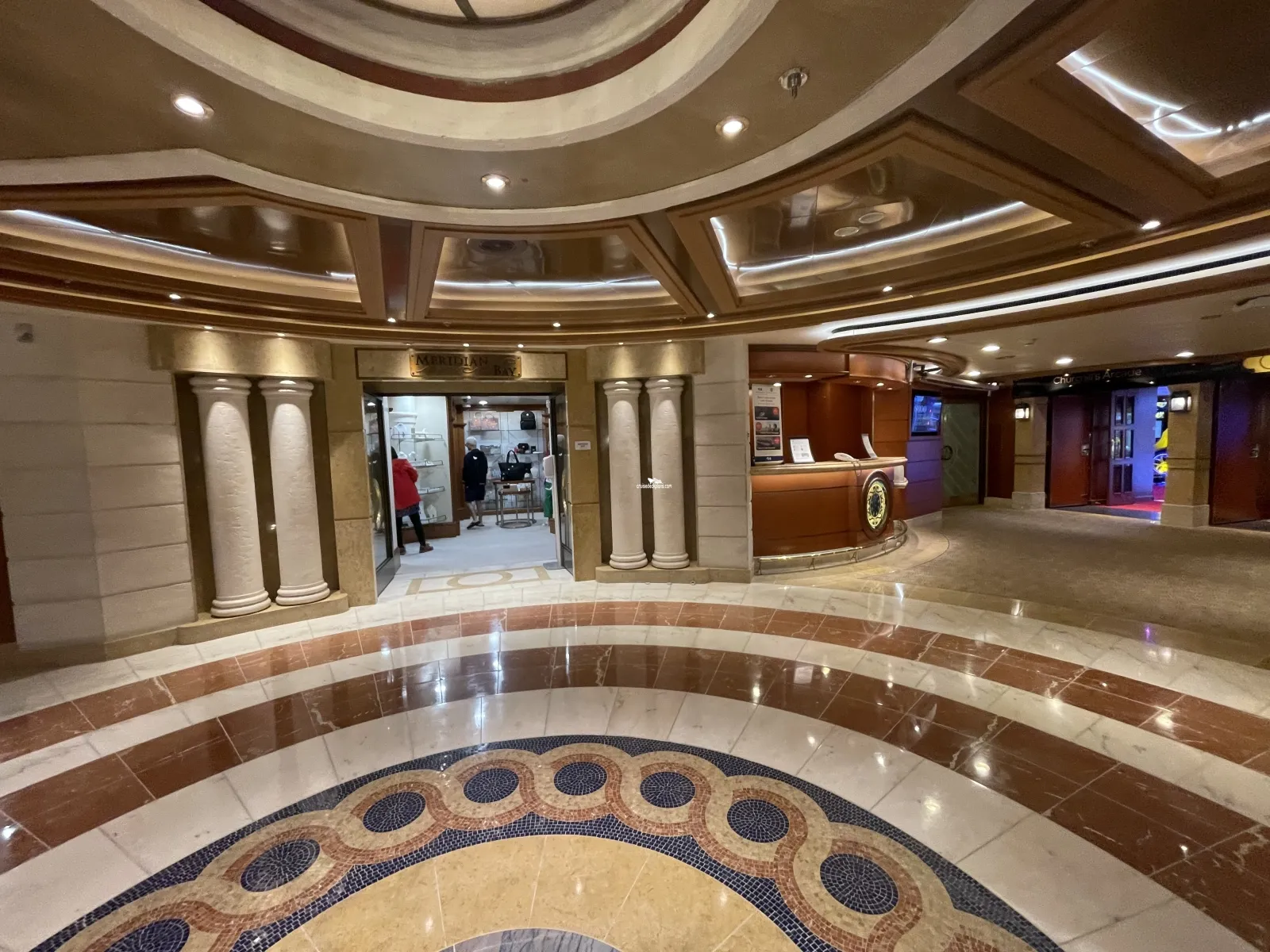 Ships main atrium. On first level is seating area, piano, dance floor, cafe and barCabin Check Tool