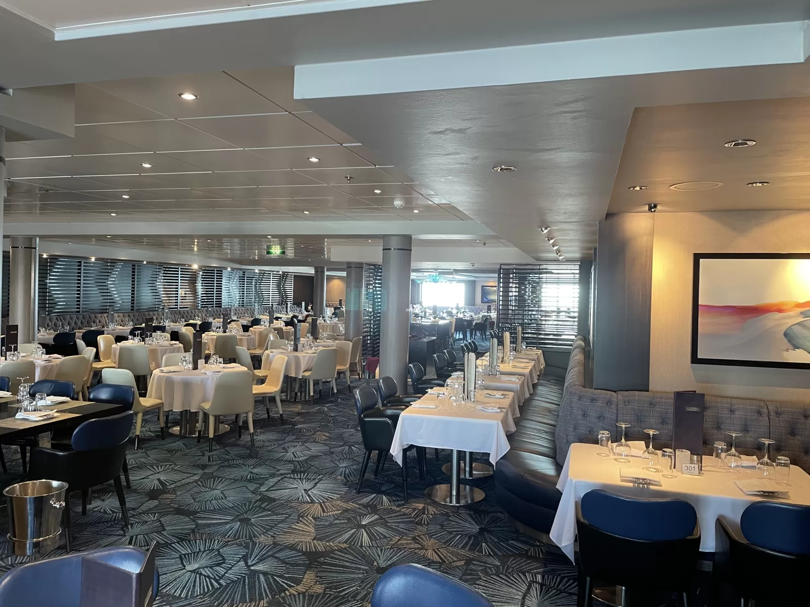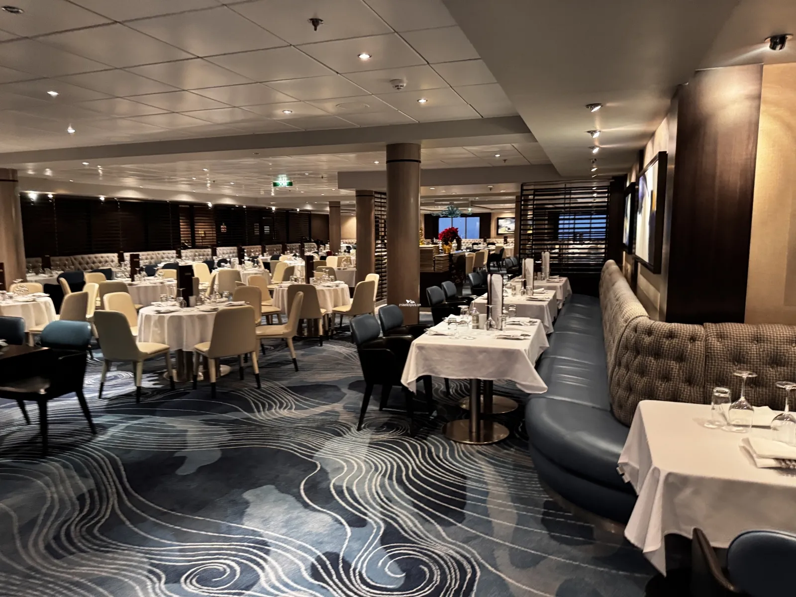 One of the ship's two main dining rooms serving a multi-course menu of freshly prepared cuisine. It is open for Breakfast (7.30am to 9.30am) Lunch (12 to 1.30pm) and Dinner (5pm to 9.30pm).Aqua Main Dining Room