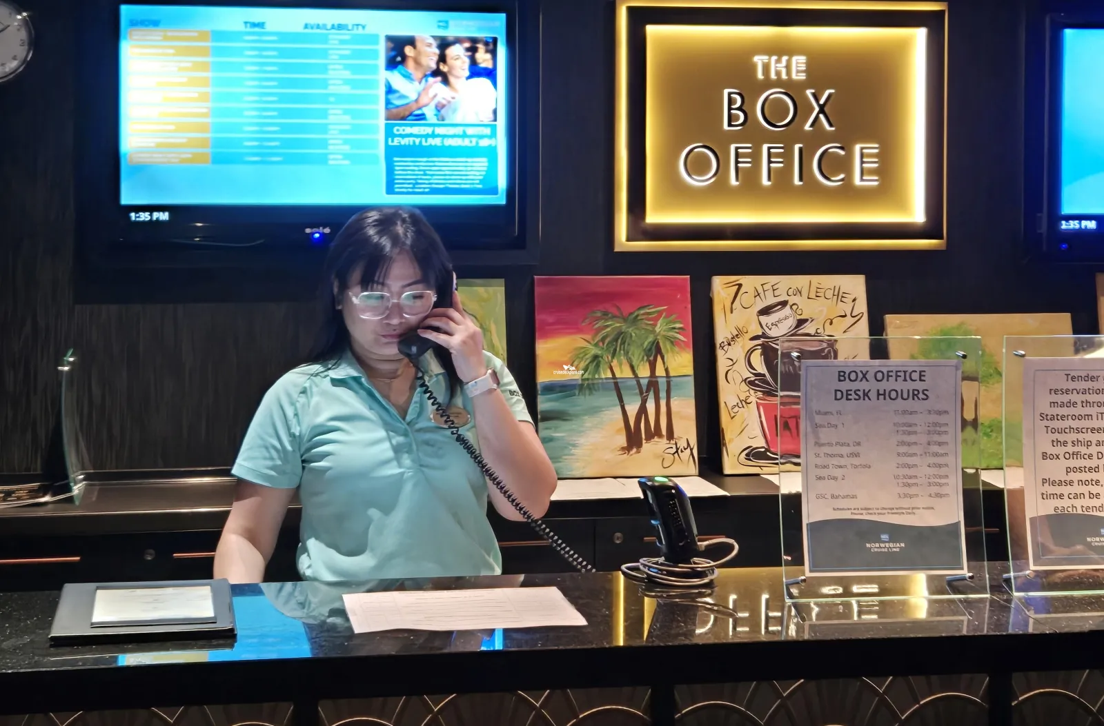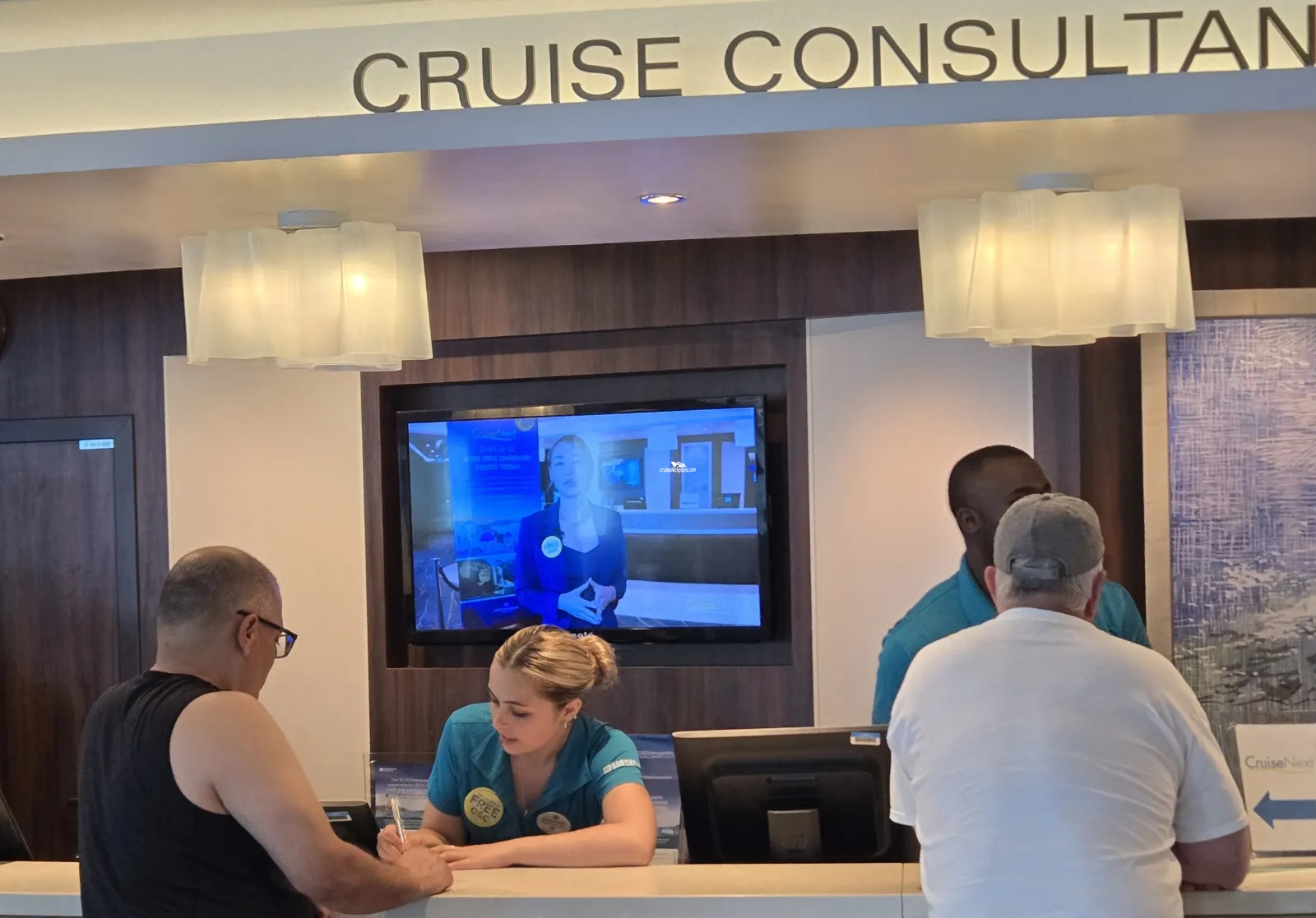 Two deck high atrium with its large open seating area at the base of the atrium on deck 6 and a giant screen used for airing live sporting events, movies and open Nintendo Wii gaming. In Atrium is guest services desk, cruise consultant, internet cafe.Cafe At The Atrium