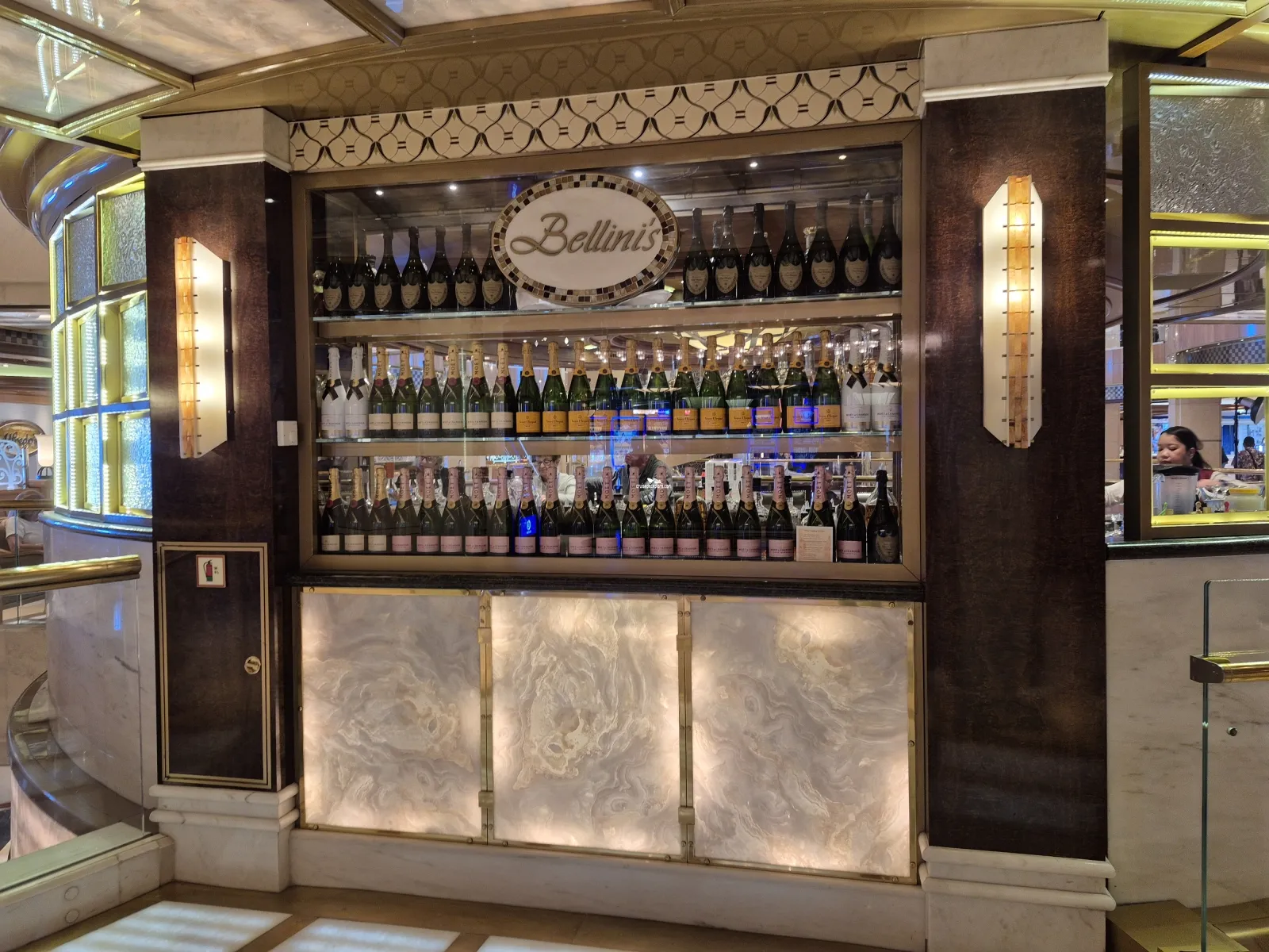 The central hub of the Royal Princess, featuring a three deck glass atrium and two sweeping marble staircases lit by lines of light descending from the apex down to the water features below. There is a stage featuring a variety of entertainment during the day and night from musicians and performers to demonstrations.Atrium
