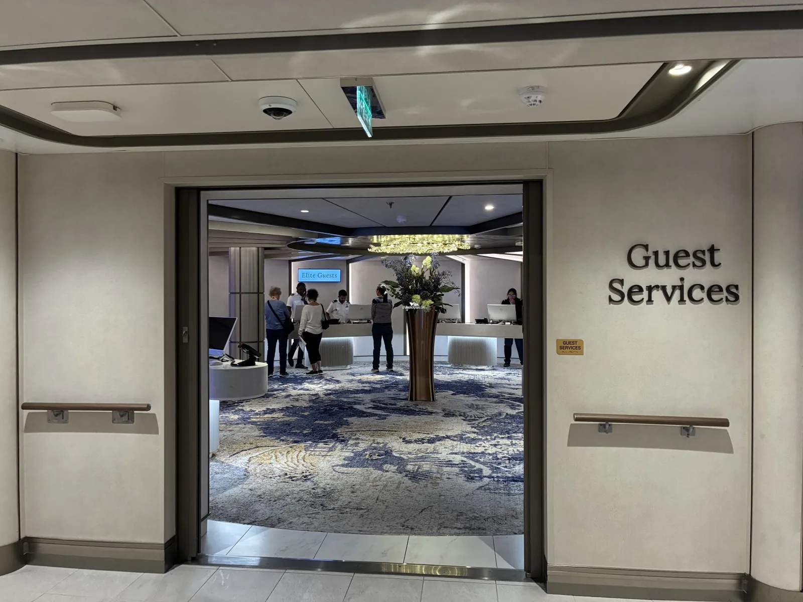 Name change from Horizon Dining Room. The Soleil Dining Room introduces a stunning, three-story main dining venue with a total capacity of 1,931 guests. This open and flexible space elevates the traditional main dining experience with stunning wake views and natural light that highlight a decorative sculpture, stretching from deck 6 to deck 8. Deck 6 is for traditional dining with two seatings at 5:00 and 7:30. Deck 7 is for reservations at various times. Deck 8 is for walk-in dining with no reservations.Guest Services