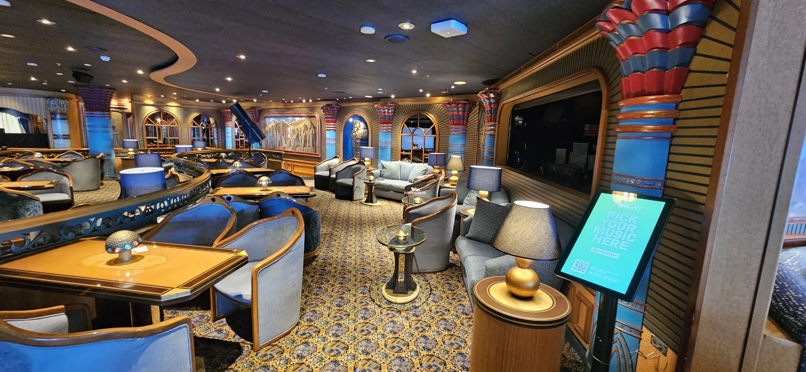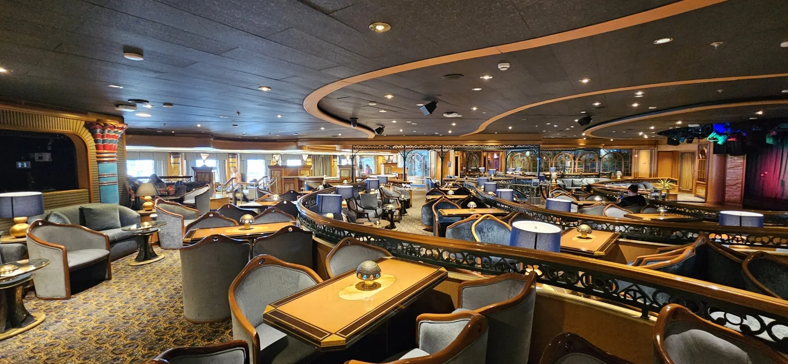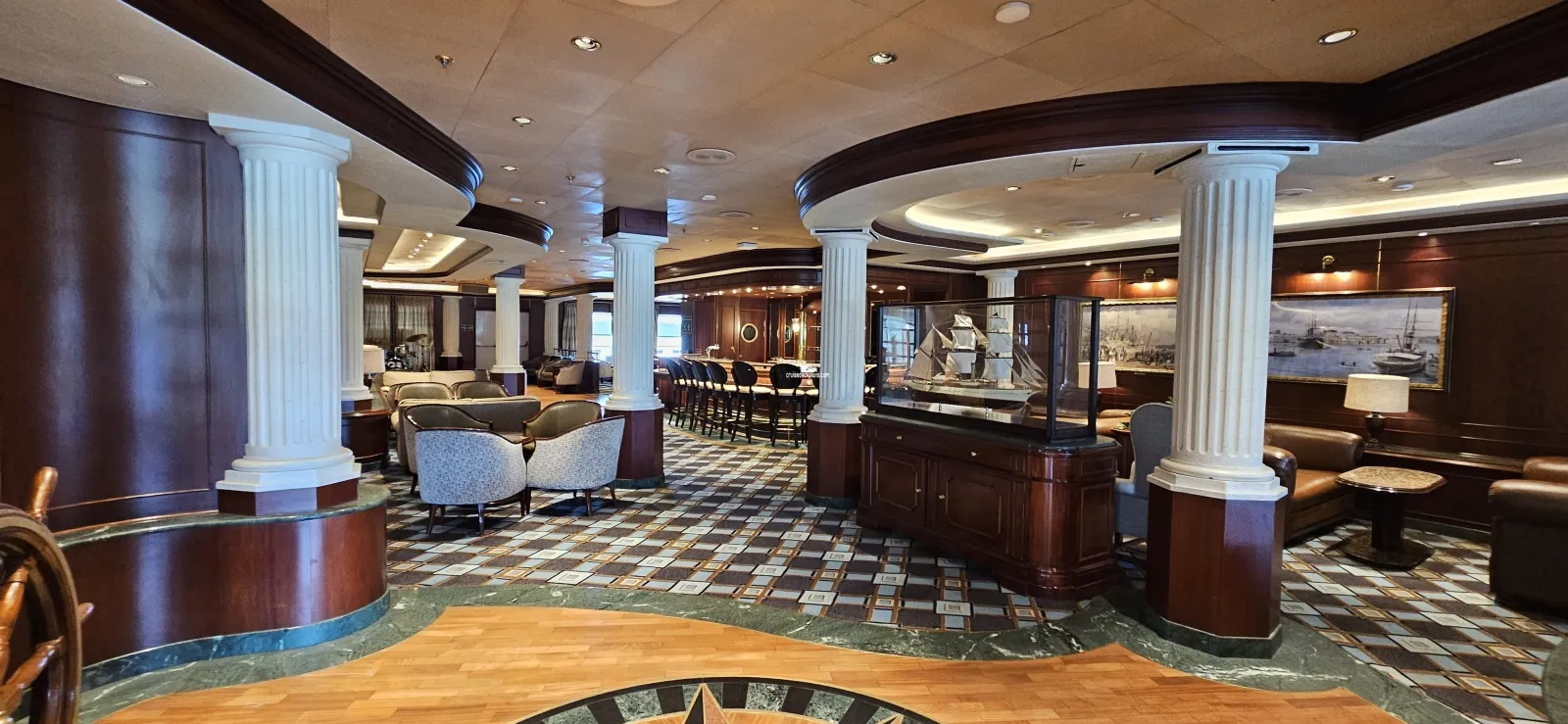 Decorated like an English gentleman's club with nautical paintings and ship models, and used for trivia games and for lectures during the day.Explorers Lounge