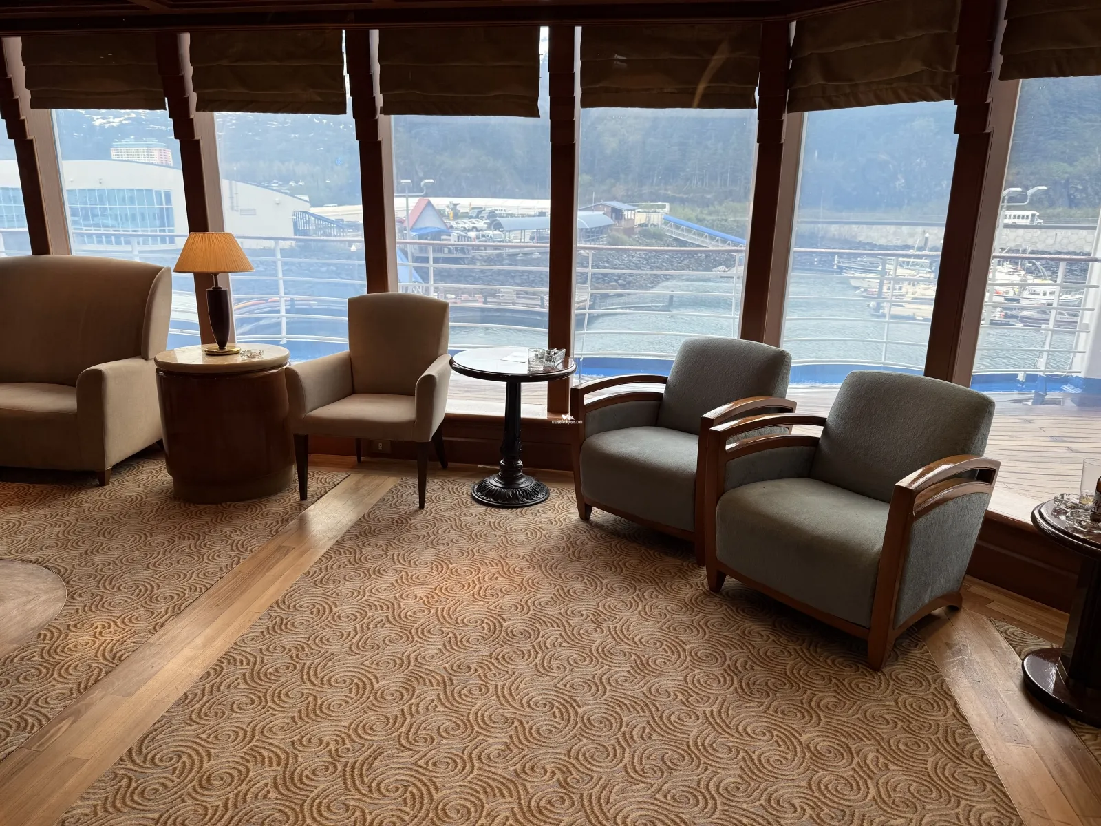 The ship's intimate smoking lounge where guests can also request a cognac from Crooners Bar next door to enjoy with their cigar.Crooners Bar