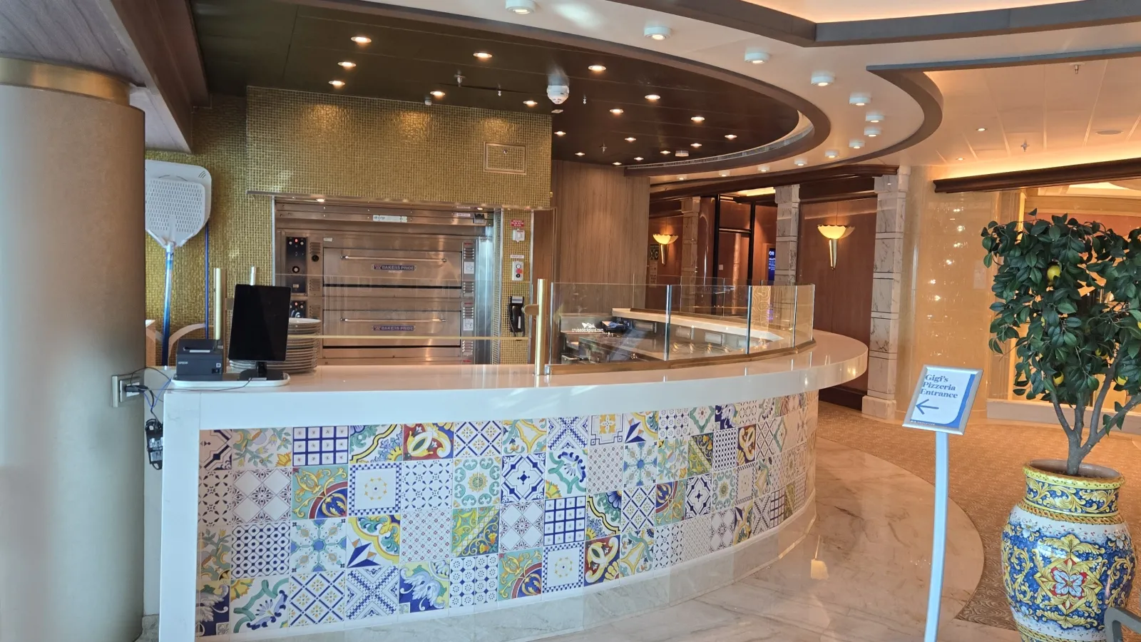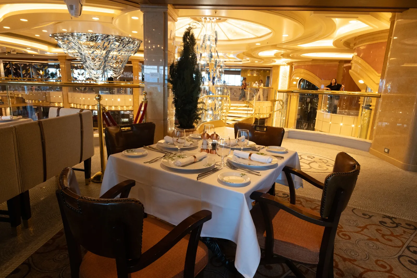 Additional charge select restaurant offering Tuscan inspired cuisine with bold and sophisticated flavours. The menu is a la carte and reservations are recommended. The restaurant features a walk through from Vines Wine Bar, where guests can enjoy a pre-dinner drink, and a centre piece displaying a wide range of Italian wines.Piazza