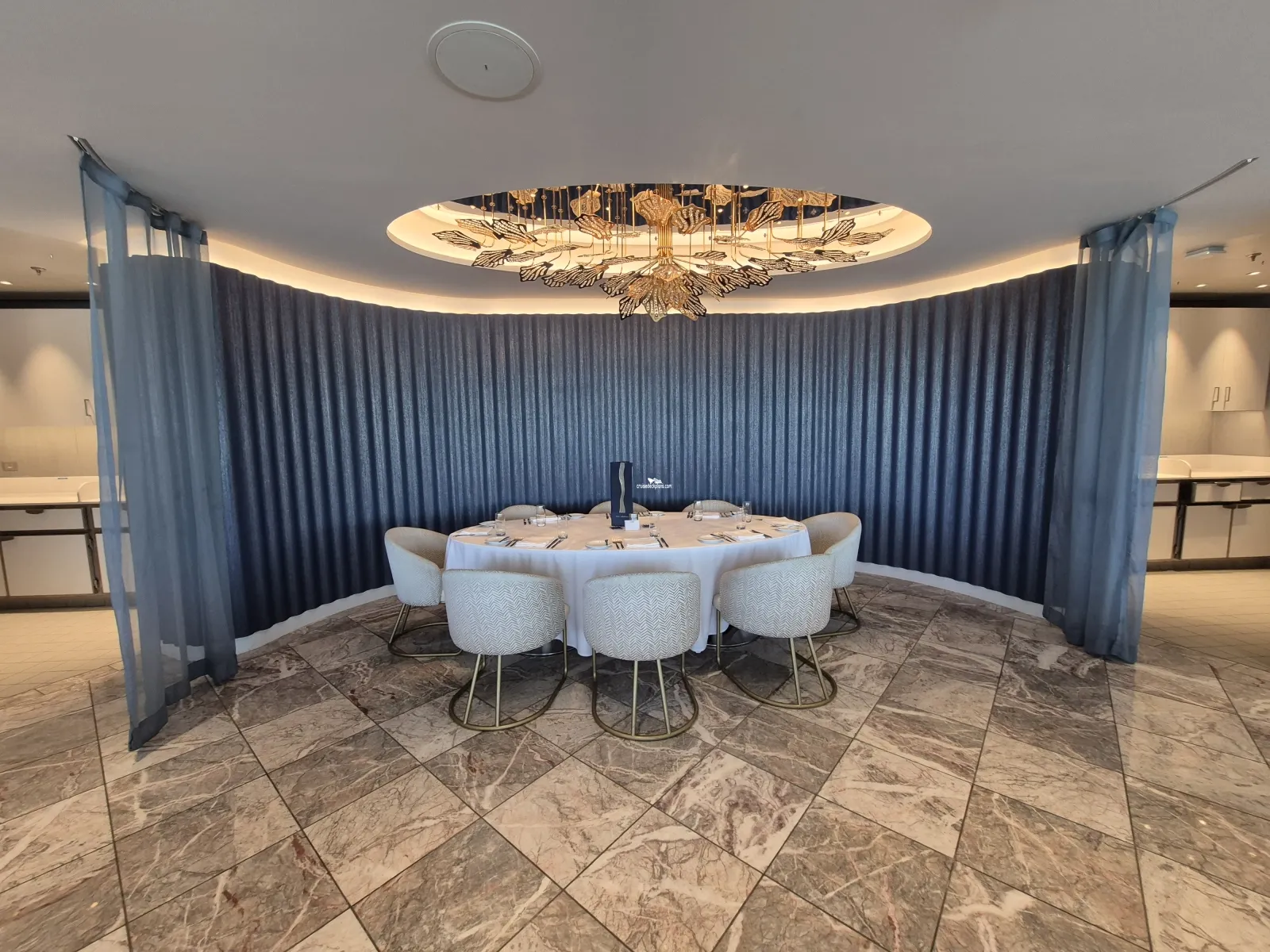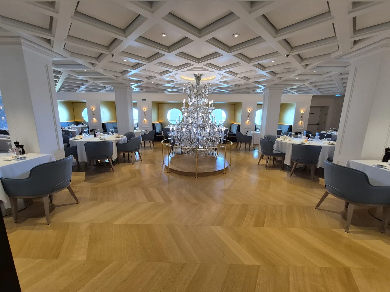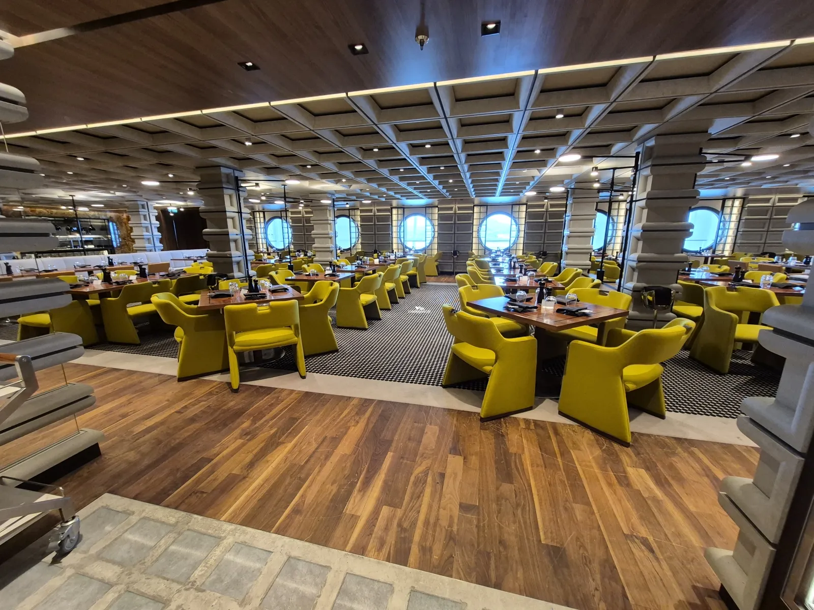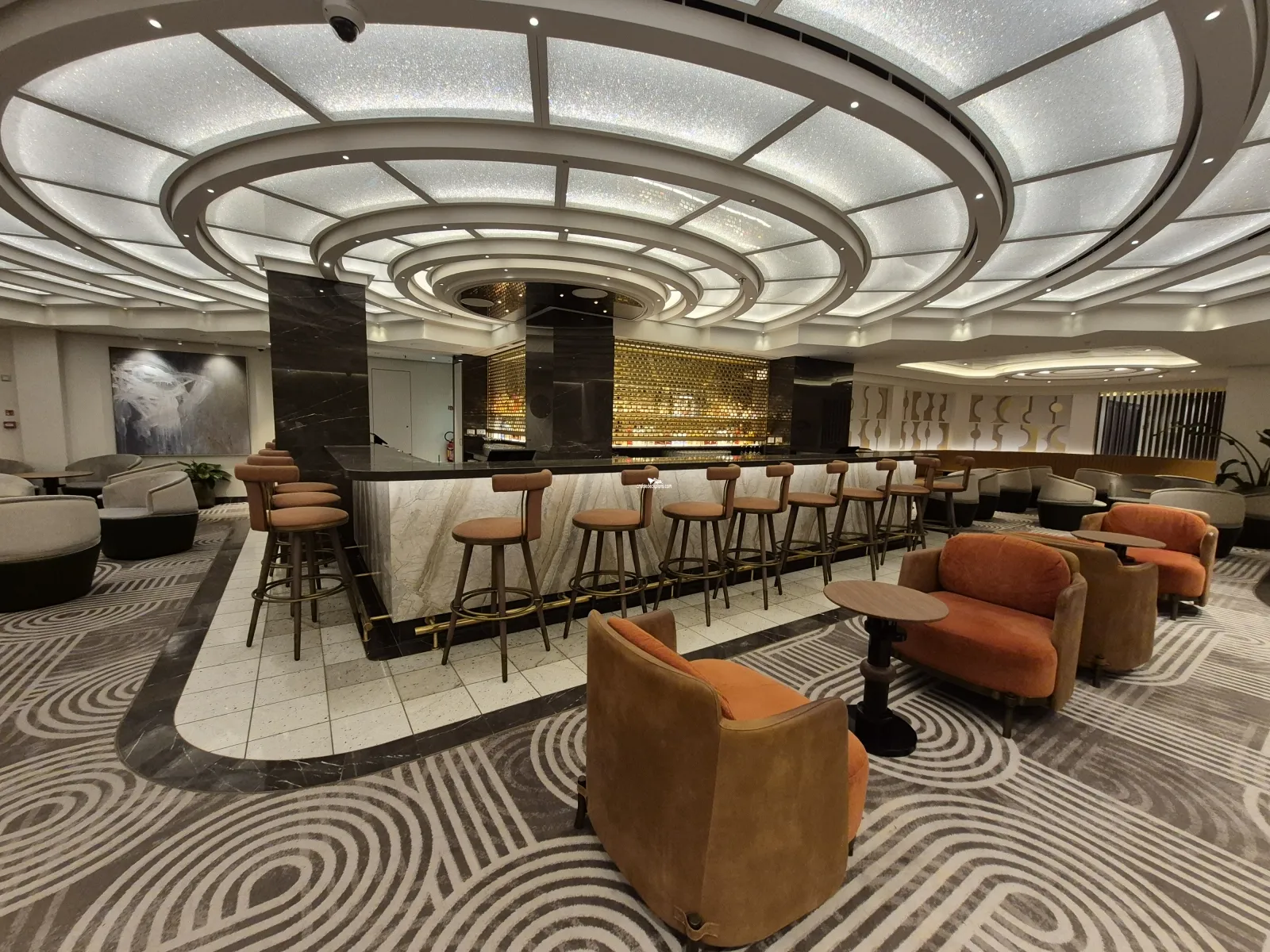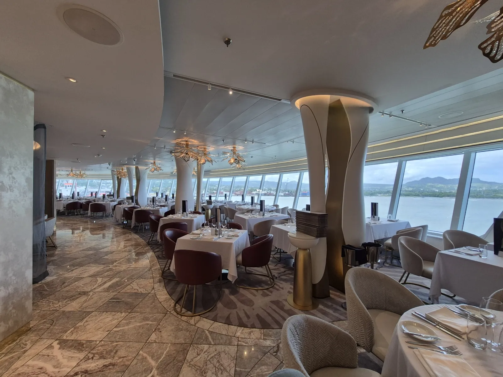 Complimentary main dining room. Features 270-degree views through floor to ceiling windows. Prepare to be wowed by the updated classic of Beef Wellington - a tender beef striploin with mushroom duxelles and wrapped in Flaky Pastry. Tap into your surroundings with the seafood paella filled with bomba rice, shrimp, sea bass, mussels, and clams and follow-it up with an American favorite - apple pie drizzled with butterscotch sauce and topped with Vanilla Ice Cream.Metropolitan Bar