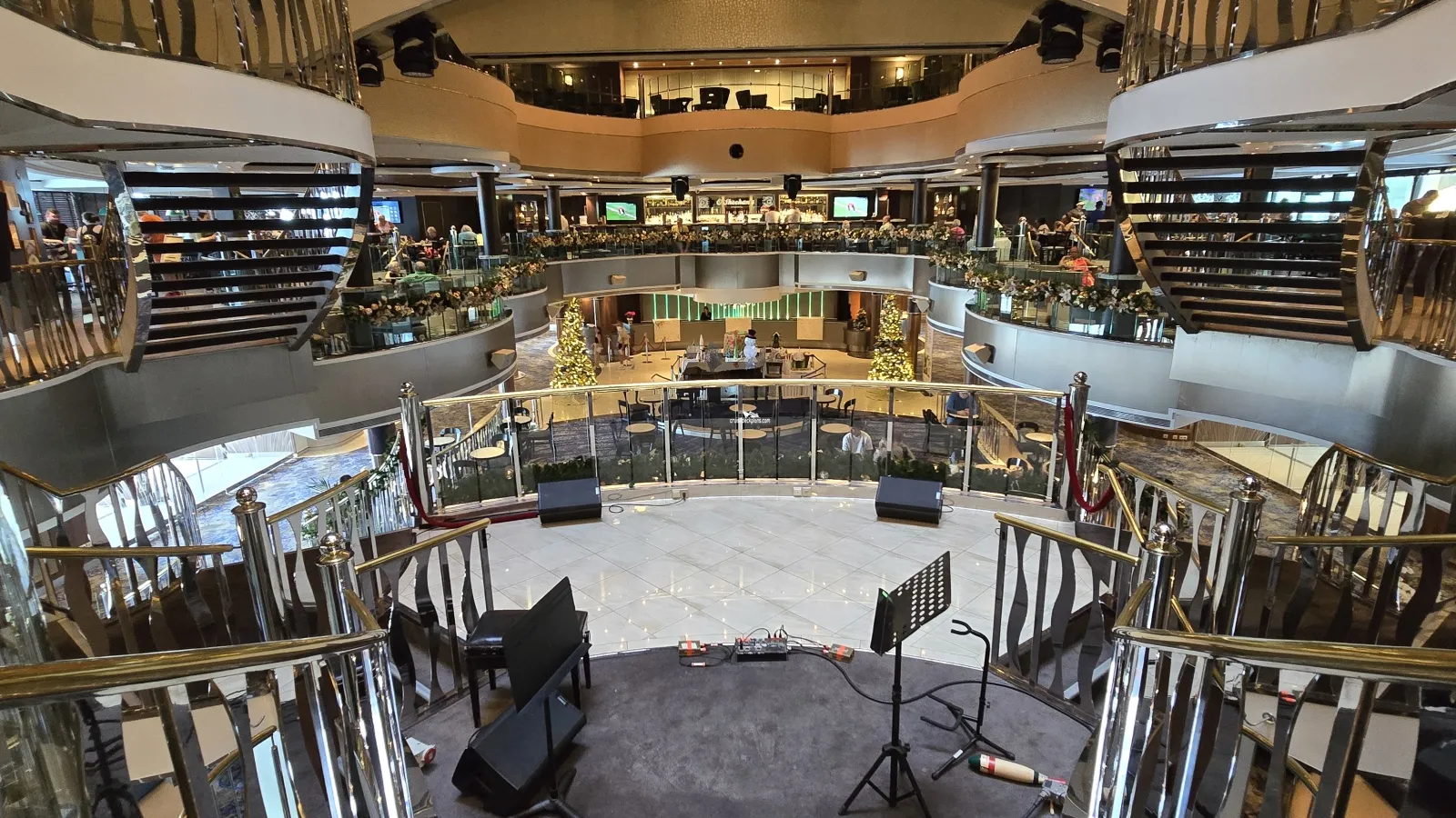 Main atrium with guest services desk, shore excursion desk, coffee bar and lounge chairs. Open to two decks above.Promenade