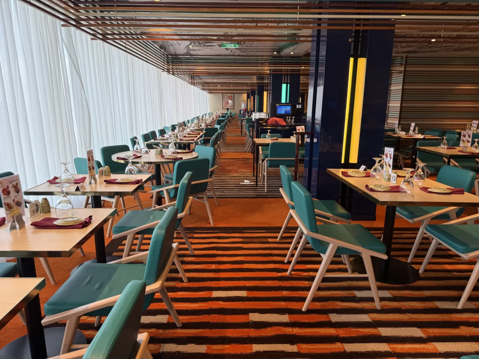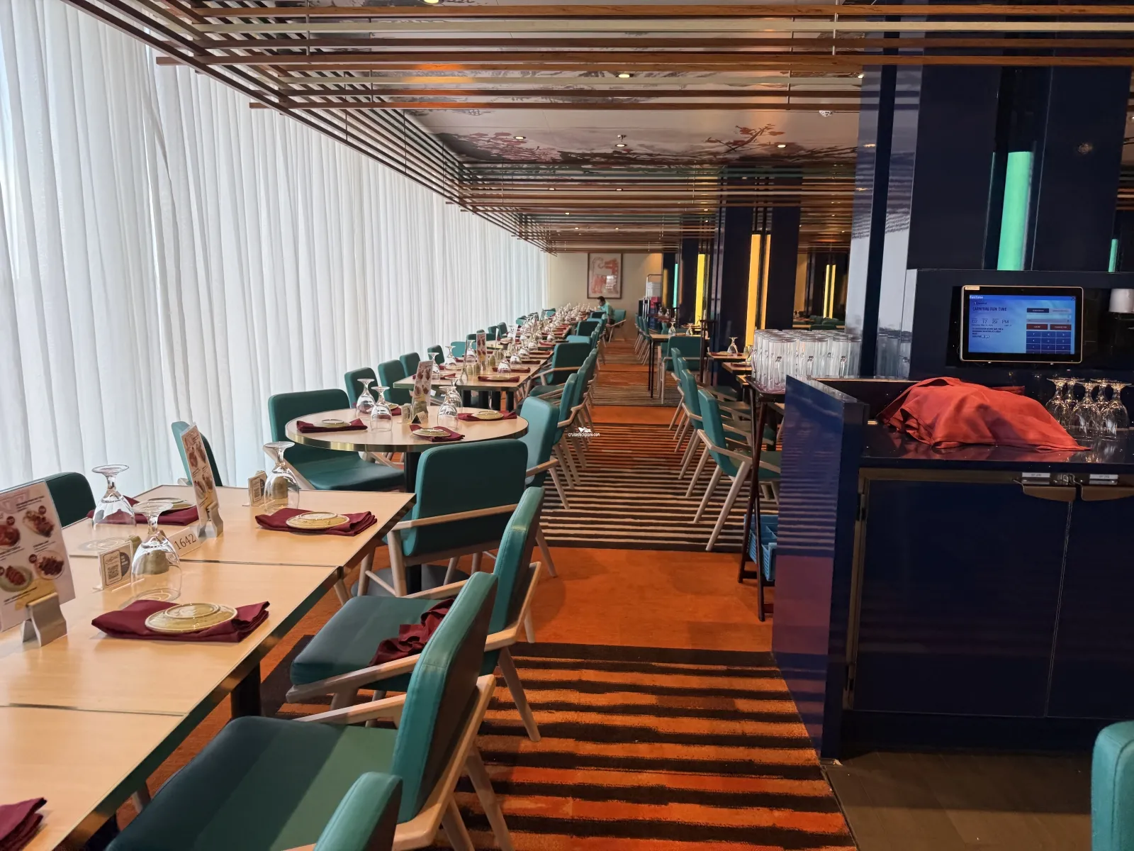 A onboard pool and indoor/outdoor bar retreat that is accessible by day and at night becomes a hot music-and-dancing spot. Serves Cuban cocktails like the classic Mojito or traditional Daiquiri, plus fresh and free Cuban snacks. Havana stateroom guests will have exclusive and easy access to the Havana pool and Havana Lounge. The pool area is a relaxation area complete with colorful umbrellas, faux palm trees, thatched patio huts and comfy seating.Havana Bar