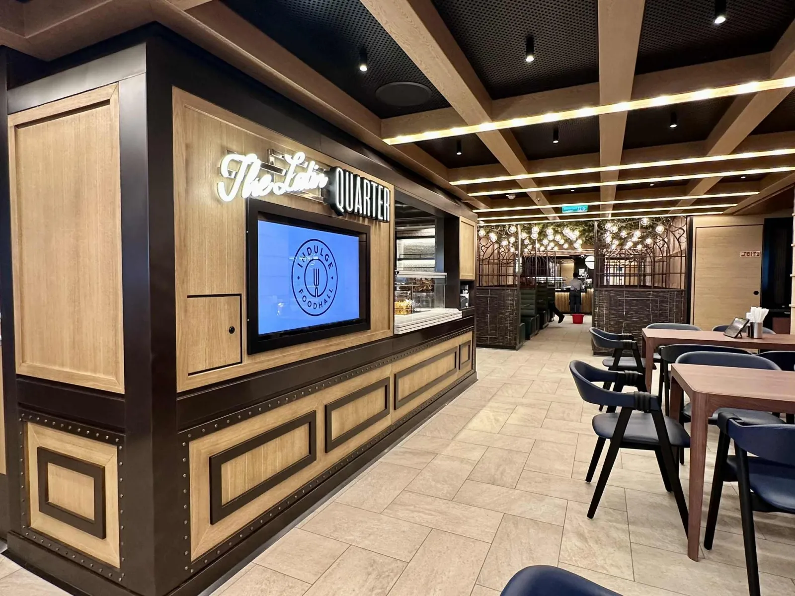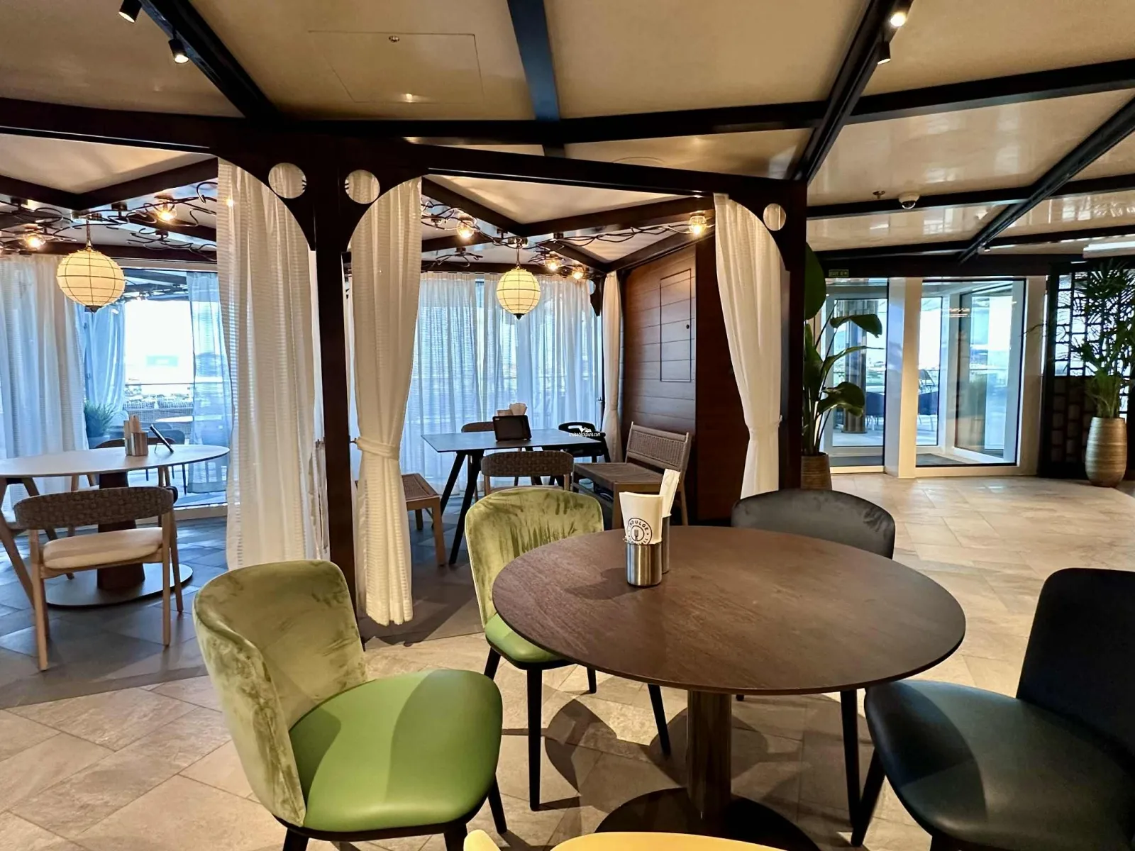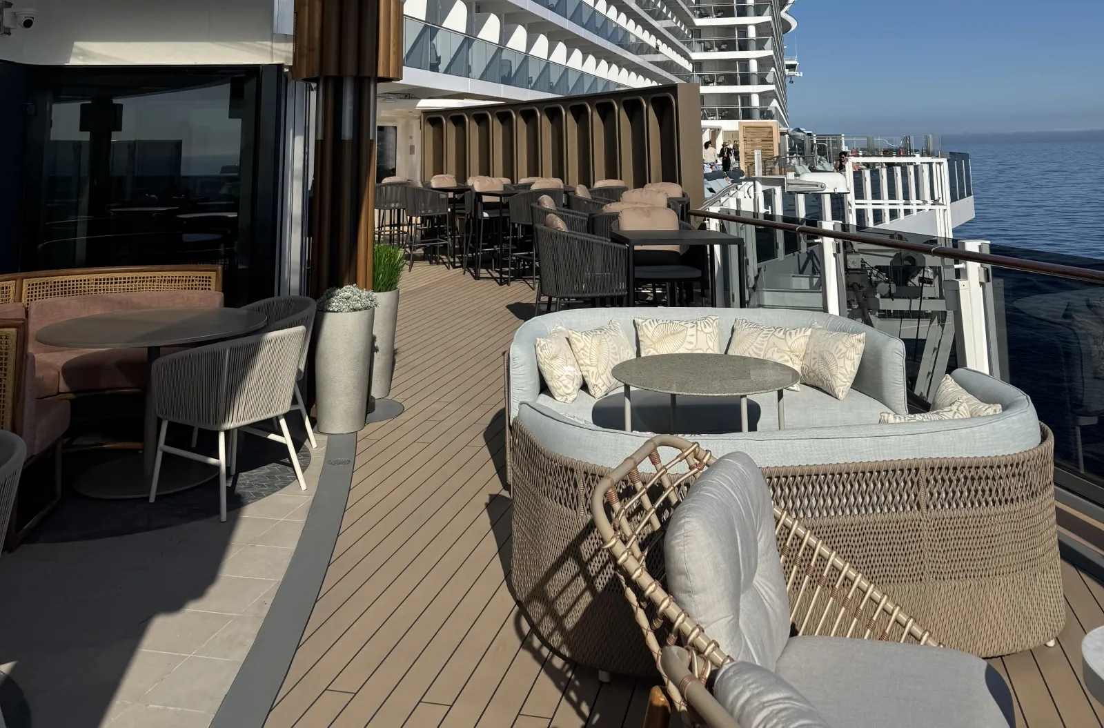 Indulge Food Hall outside area with various types of seating, cabanas and hammocks. Located here is the Sun Bar for cocktails. There is also a virtual firepit. Note: Soleil and Luna Bars only offer a limited selection of drinks.Oceanwalk