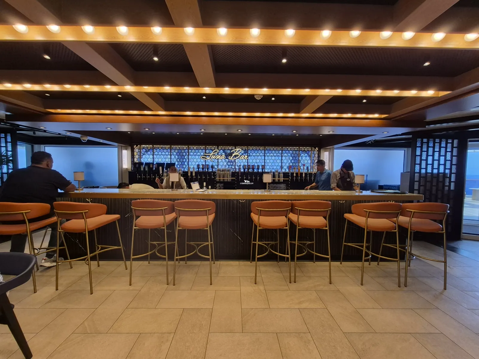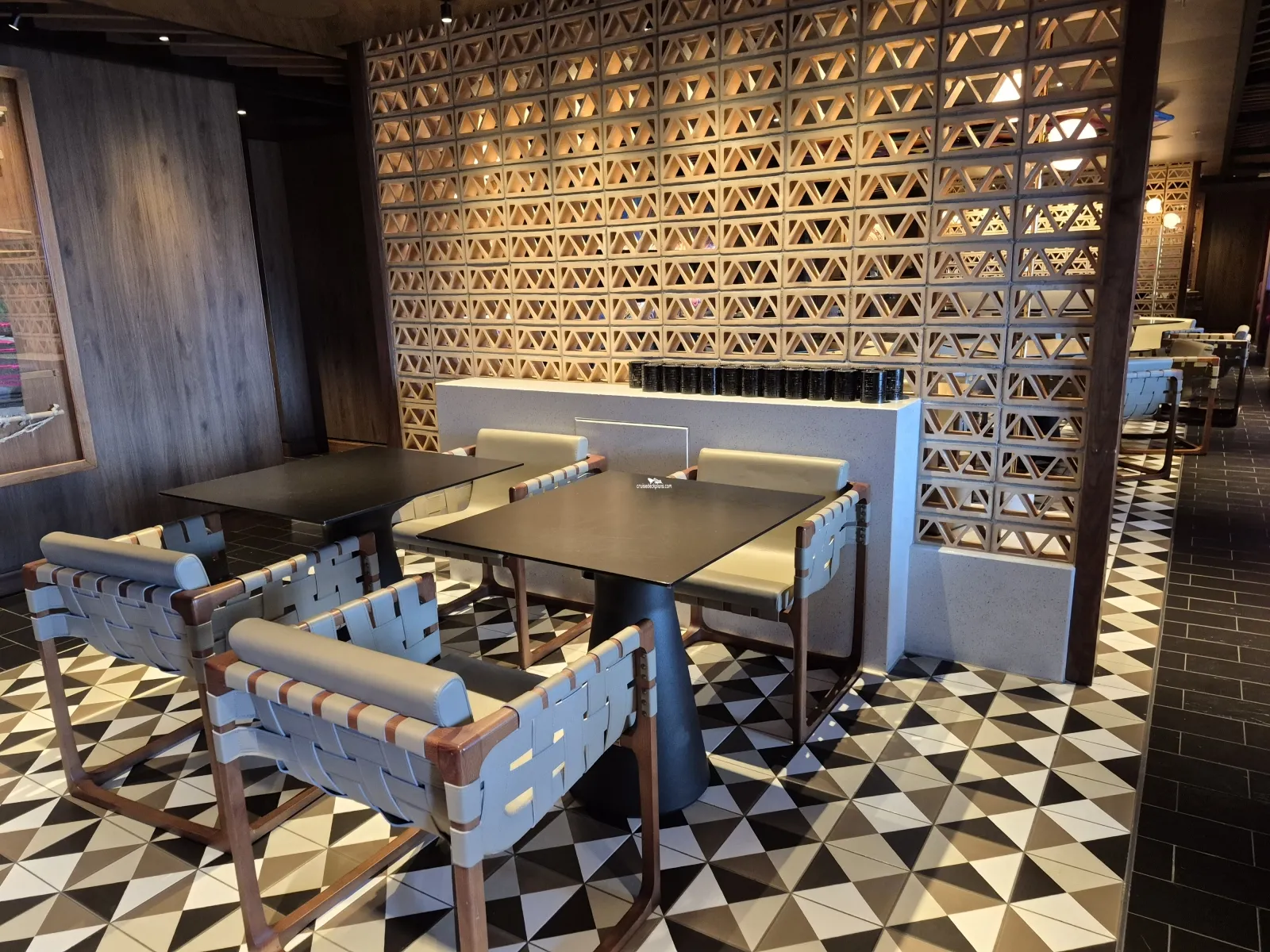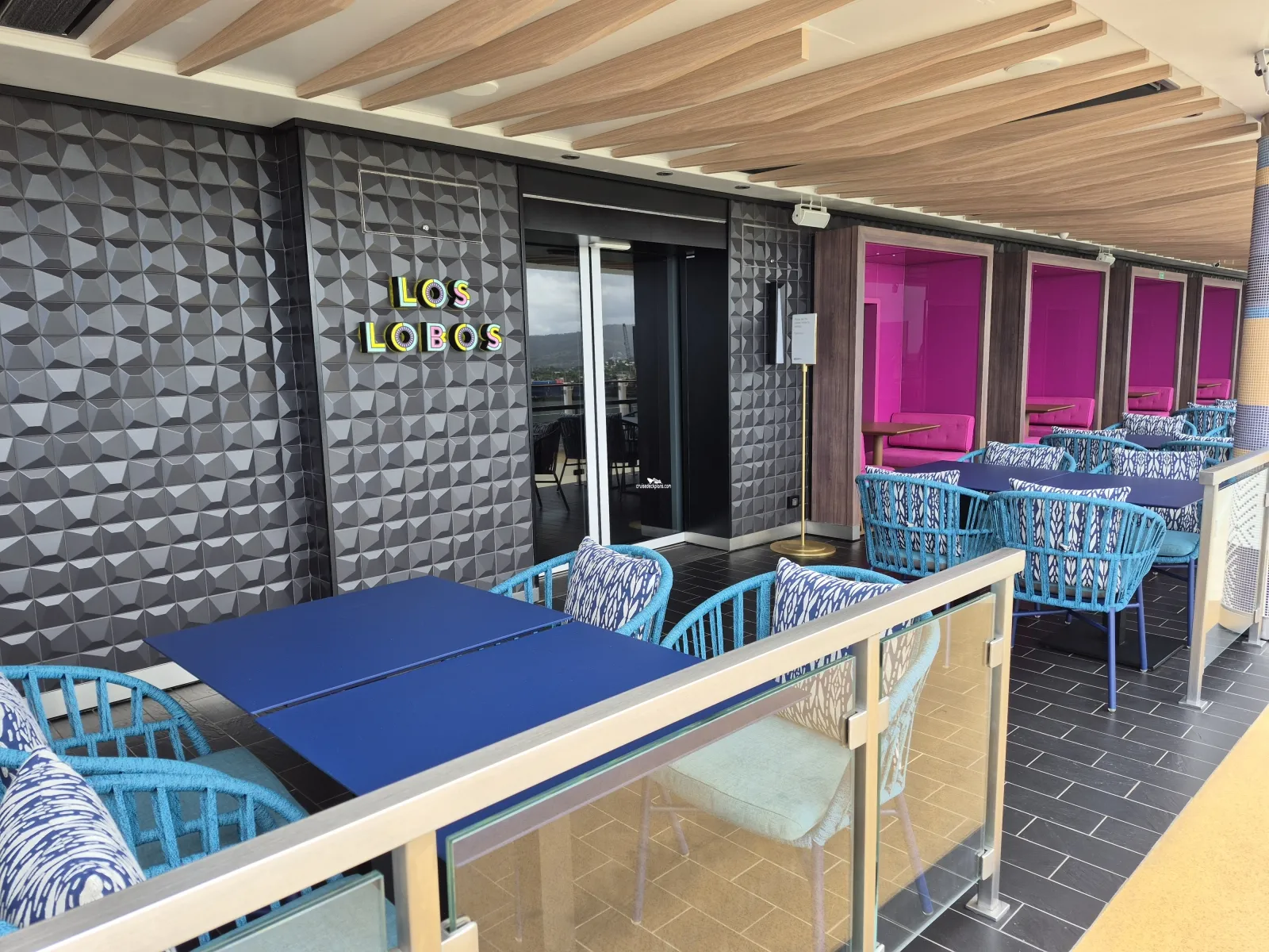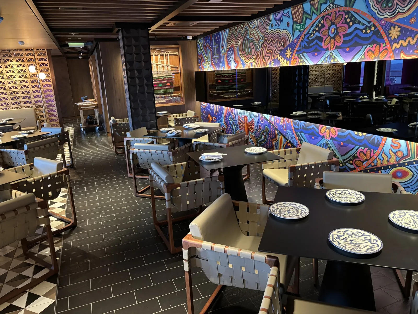 Indulge Food Hall outside area with various types of seating, cabanas and hammocks. Located here is the Sun Bar for cocktails. There is also a virtual firepit. Note: Soleil and Luna Bars only offer a limited selection of drinks.Oceanwalk