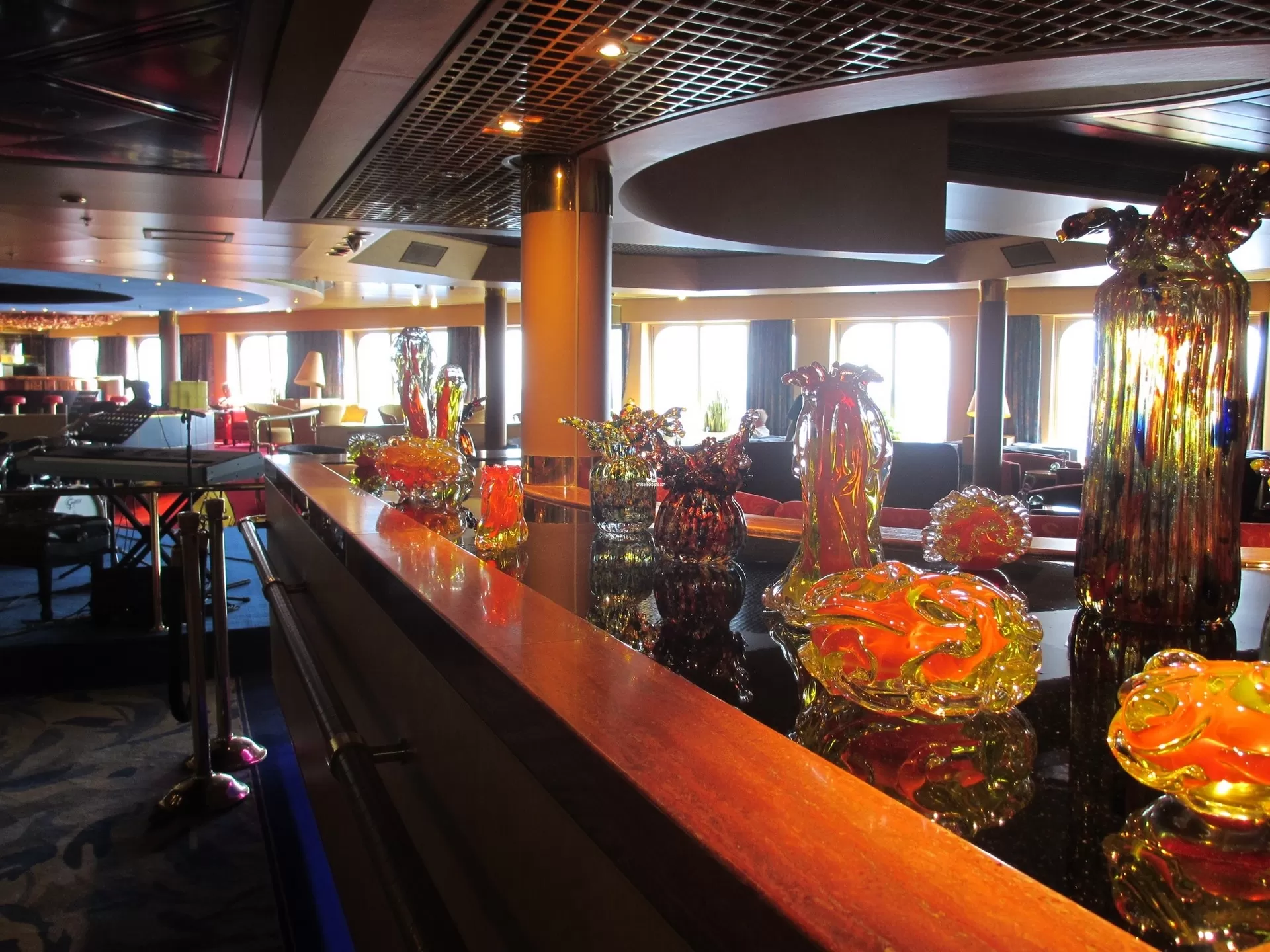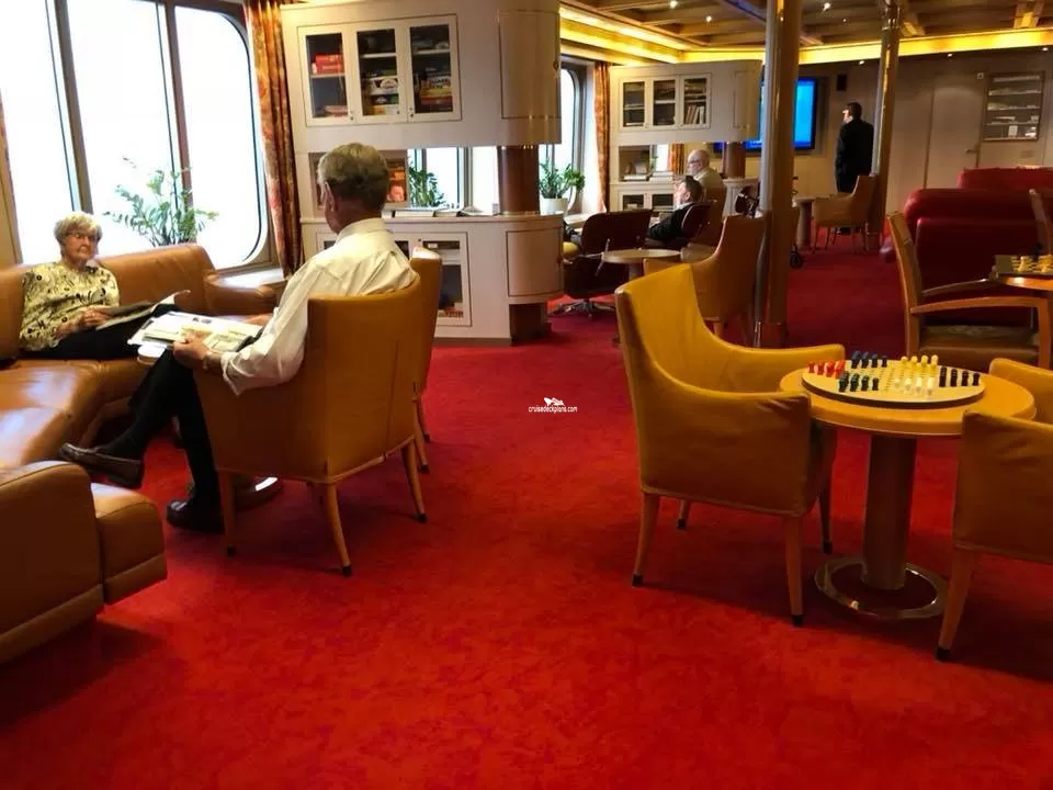 An intimate reservations only additional charge restaurant. 62 seats. Charges for eating here are $10 per head for lunch and $25 per head for dinner. Under 12's eat free whilst teens cost 50% of the adult charges. Dishes on offer range from premium sterling silver beef, filet mignon and jumbo prawns, and broiled lobster tail to Caesar salad and lobster bisque for starters and chocolate and raisin bread and butter pudding or baked Alaska for dessert.Explorations Cafe