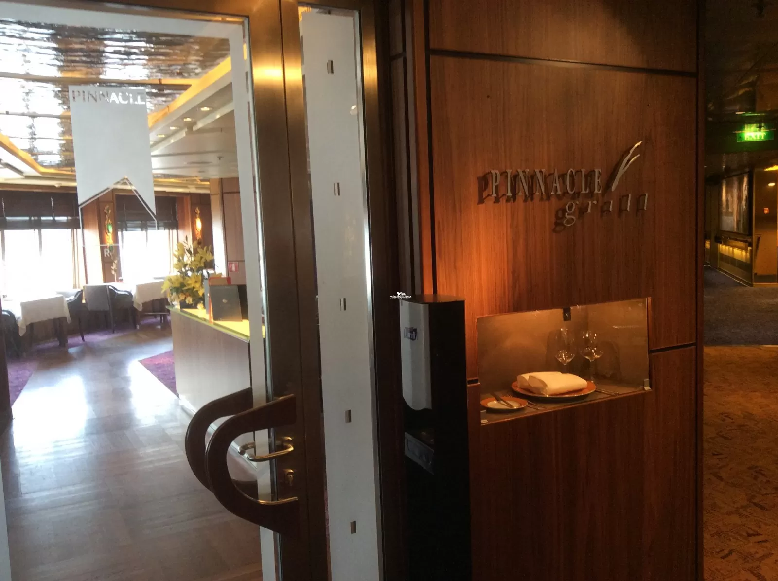 Open for breakfast, lunch, afternoon tea and dinner seating 696 people, the restaurant offers a choice of either traditional pre-set seating and dining times or the ships "As You Wish" freedom dining. For dinner guests have the option of flexible dining on deck 2 between 5.15 and 9pm or set seating on deck 3 with a choice of early (5.45pm) or late (8pm) times. Dinner comprises of 5 courses ranging from appetizers of steamed mussels to fettuccine, chicken and desserts.Pinnacle Grill