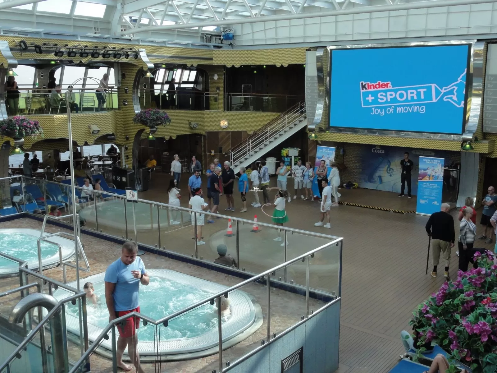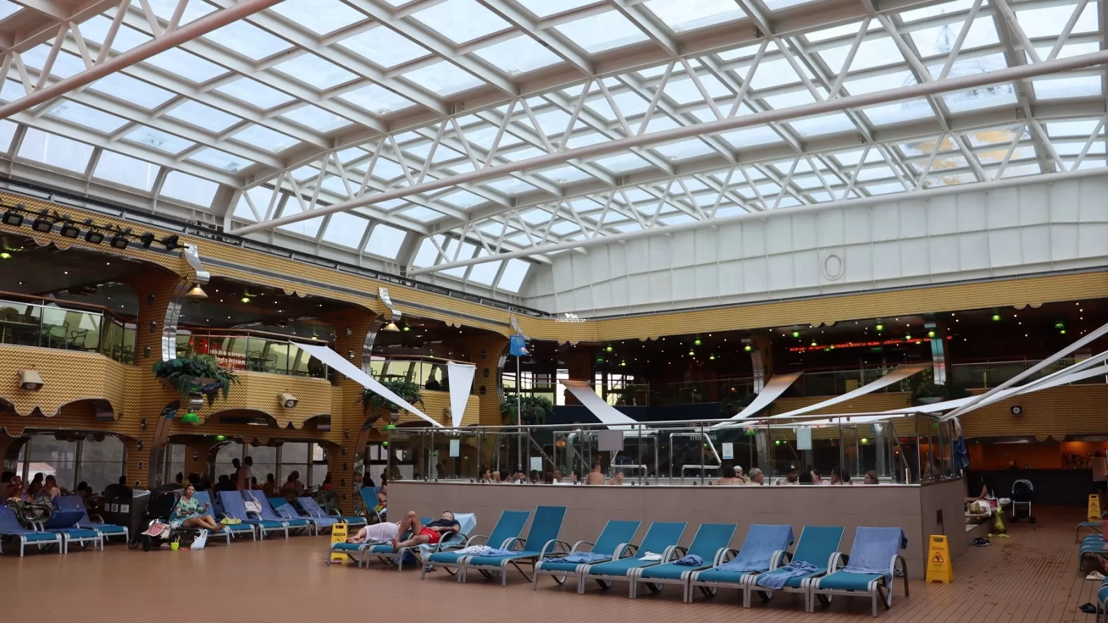A large pool area protected from inclement weather by the ship's retractable glass roof and features a grill area and bar and is flanked by the ship's giant screen airing a variety of music and sporting events.Lido Ipanema