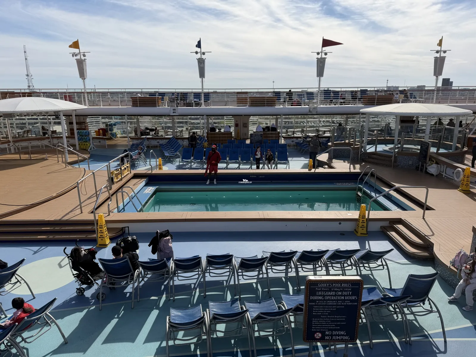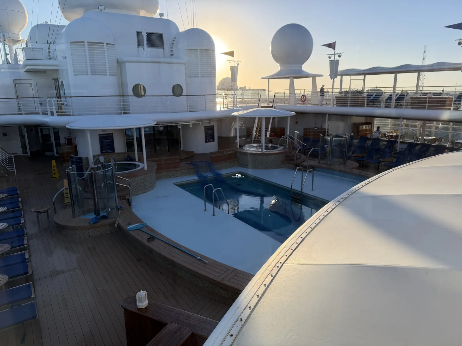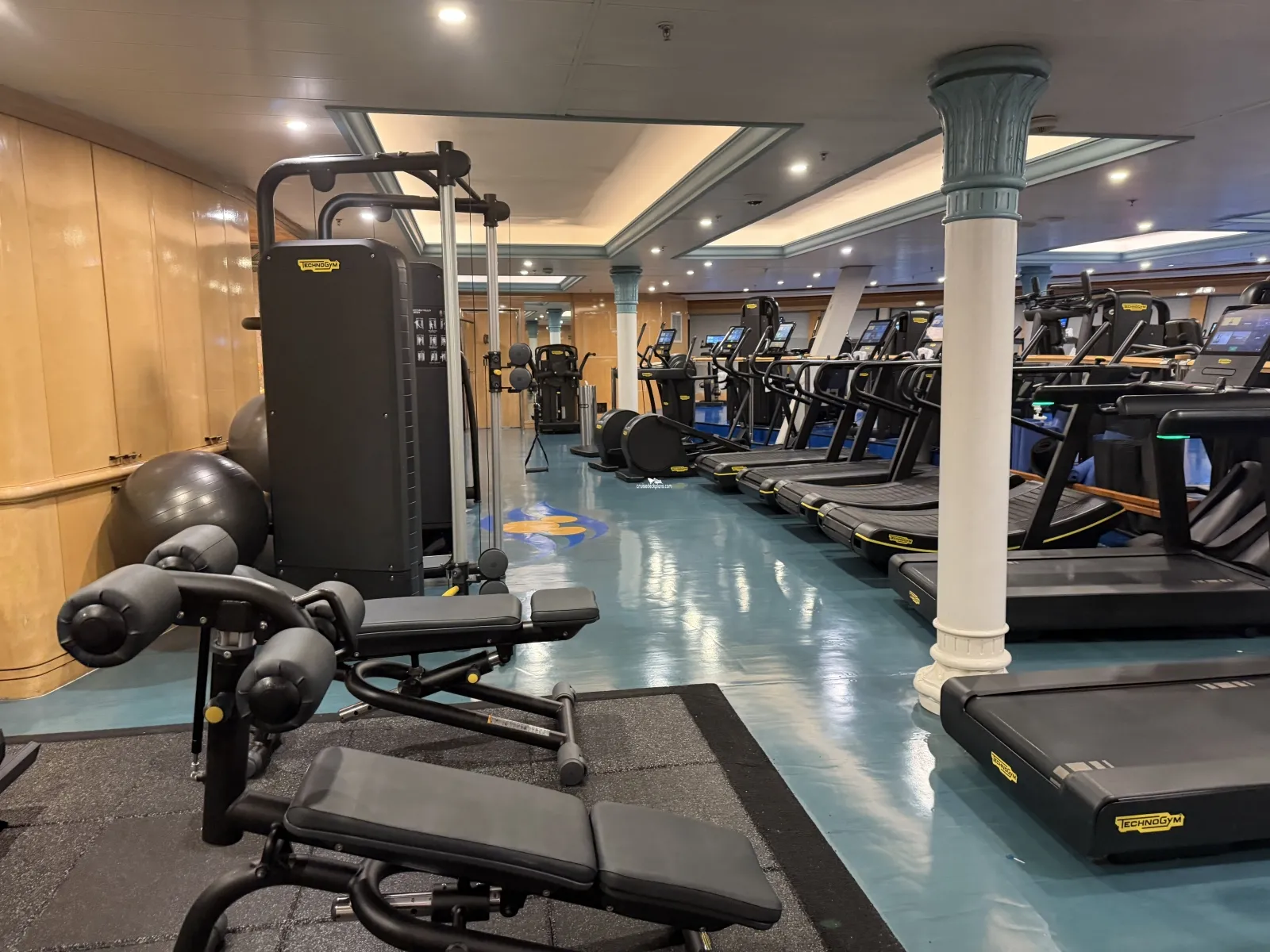 The pool is designed for guests 18 years of age and older with a maximum depth of 4 feet and includes 2 whirlpool spas and around 40 teak deck lounge chairs with plush cushions.Fitness Center