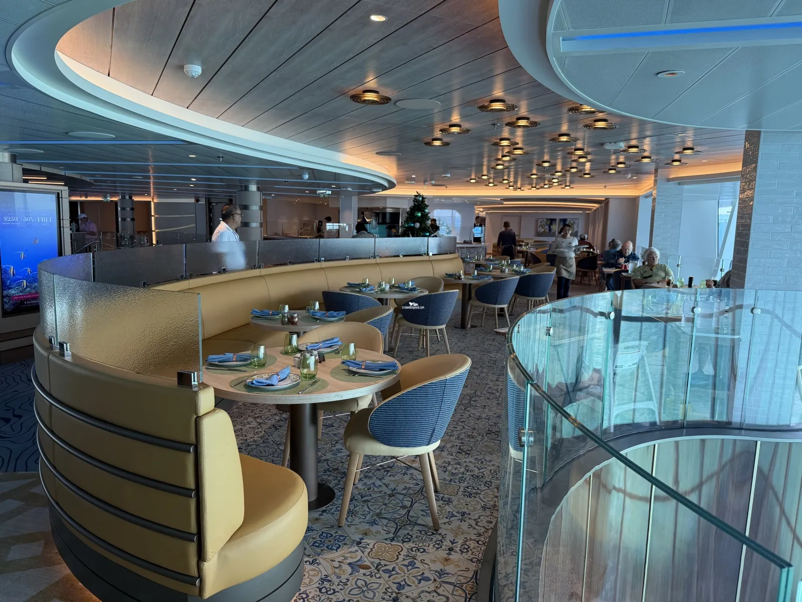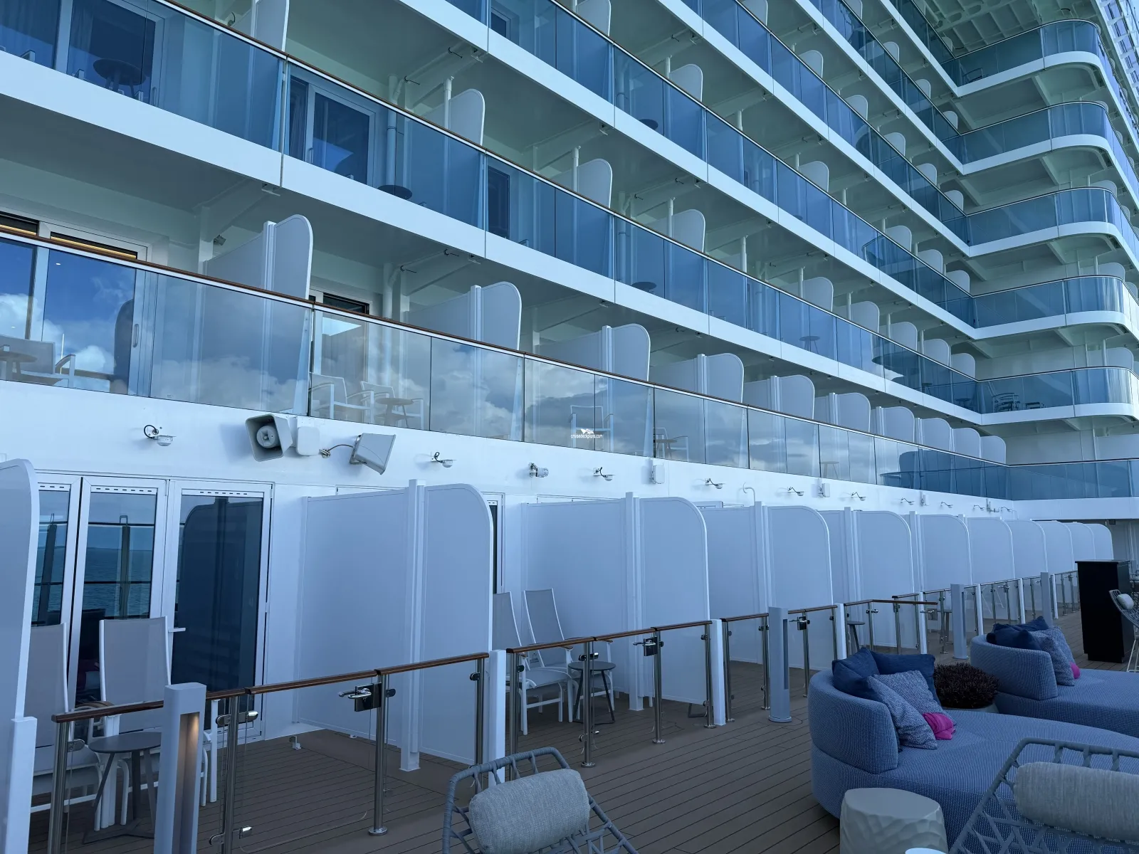 A private deck area (located forward on both the starboard and port side of ship) reserved for guests in Reserved Cabanas Staterooms. Key card required. The deck has loungers, soft seating, outdoor shower, hot tub.Americana Diner