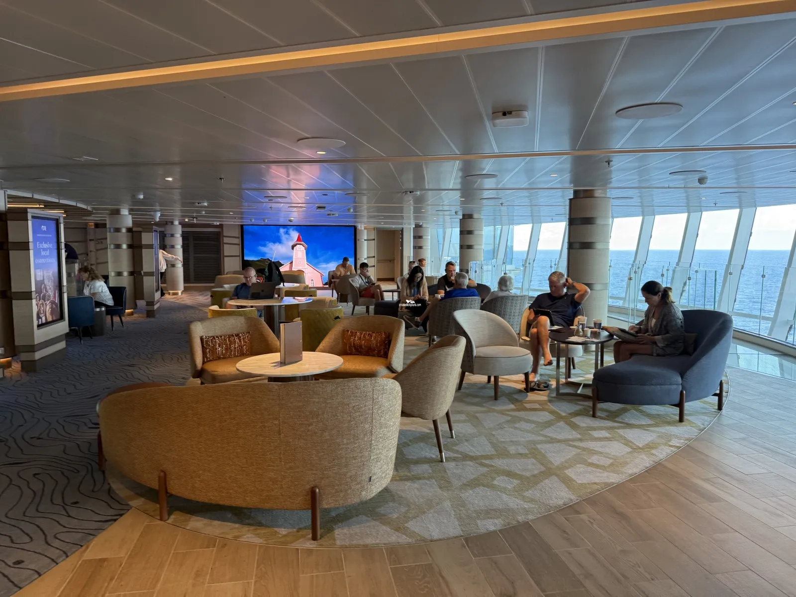 Three level atrium featuring large open windows to view the passing sea. The lower level features a bar and lounge area. Games shows and bands often are hosted here with space for up to 300 people. The sound will affect all nearby venues.Cabana Deck