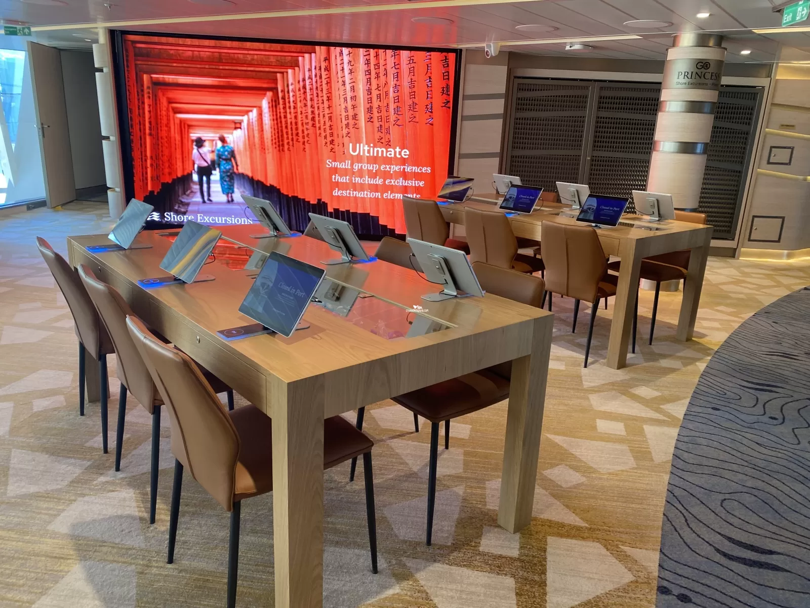 Three level atrium featuring large open windows to view the passing sea. The lower level features a bar and lounge area. Games shows and bands often are hosted here with space for up to 300 people. The sound will affect all nearby venues.Cabana Deck