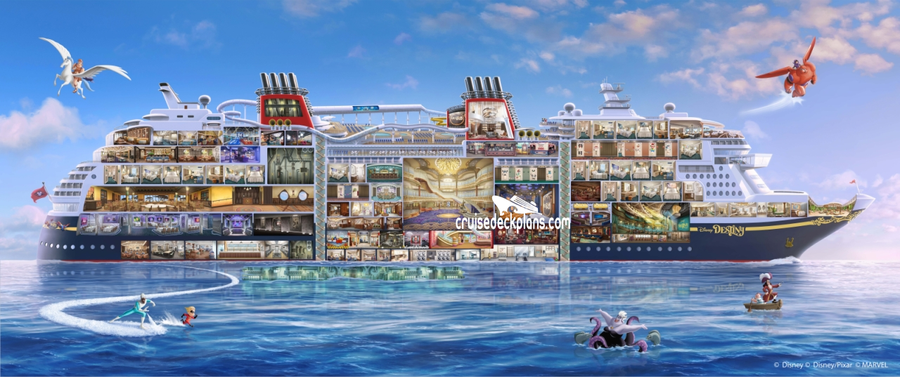 On this page you will find pictures of Disney Destiny cruise ship. Cruisedeckplans.com also provides links to our own pages filled with Disney Destiny public area venue pictures. On all our albums you can click on the picture for a larger image and slideshow. We thank the thousands of contributors for the photos.