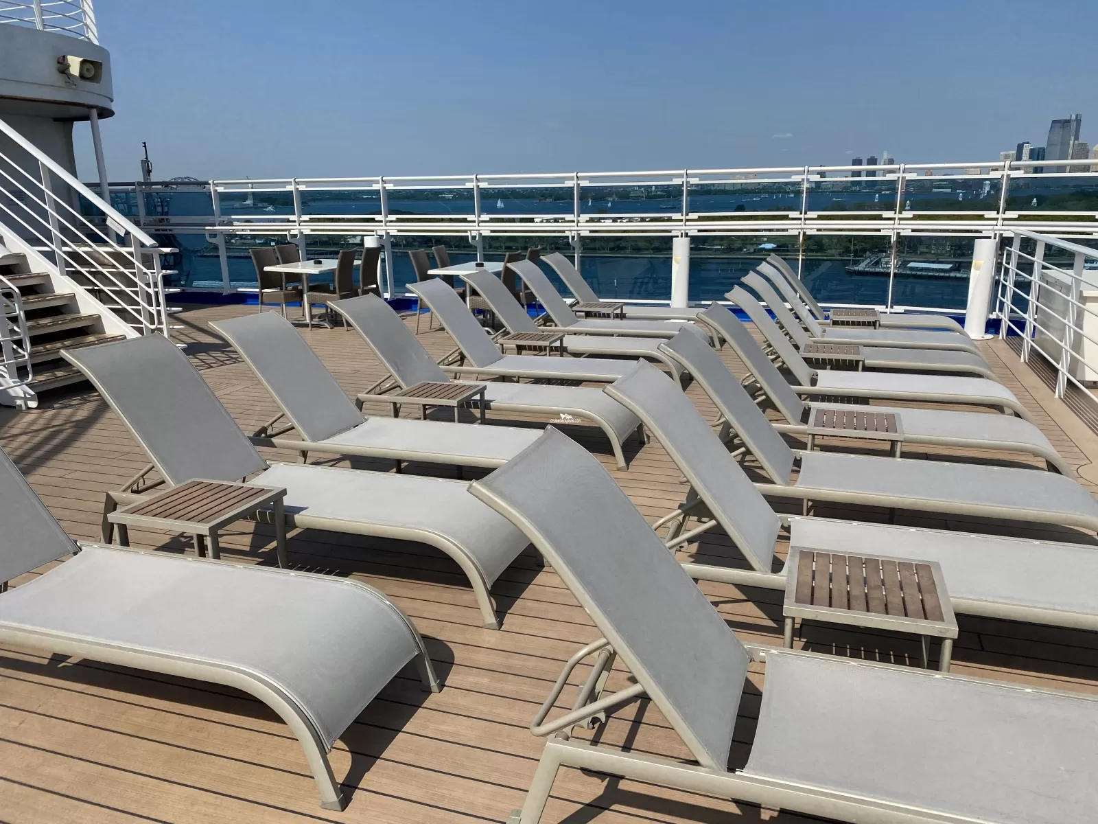 Outdoor sunbathing area on aft of ship overlooking the wake.