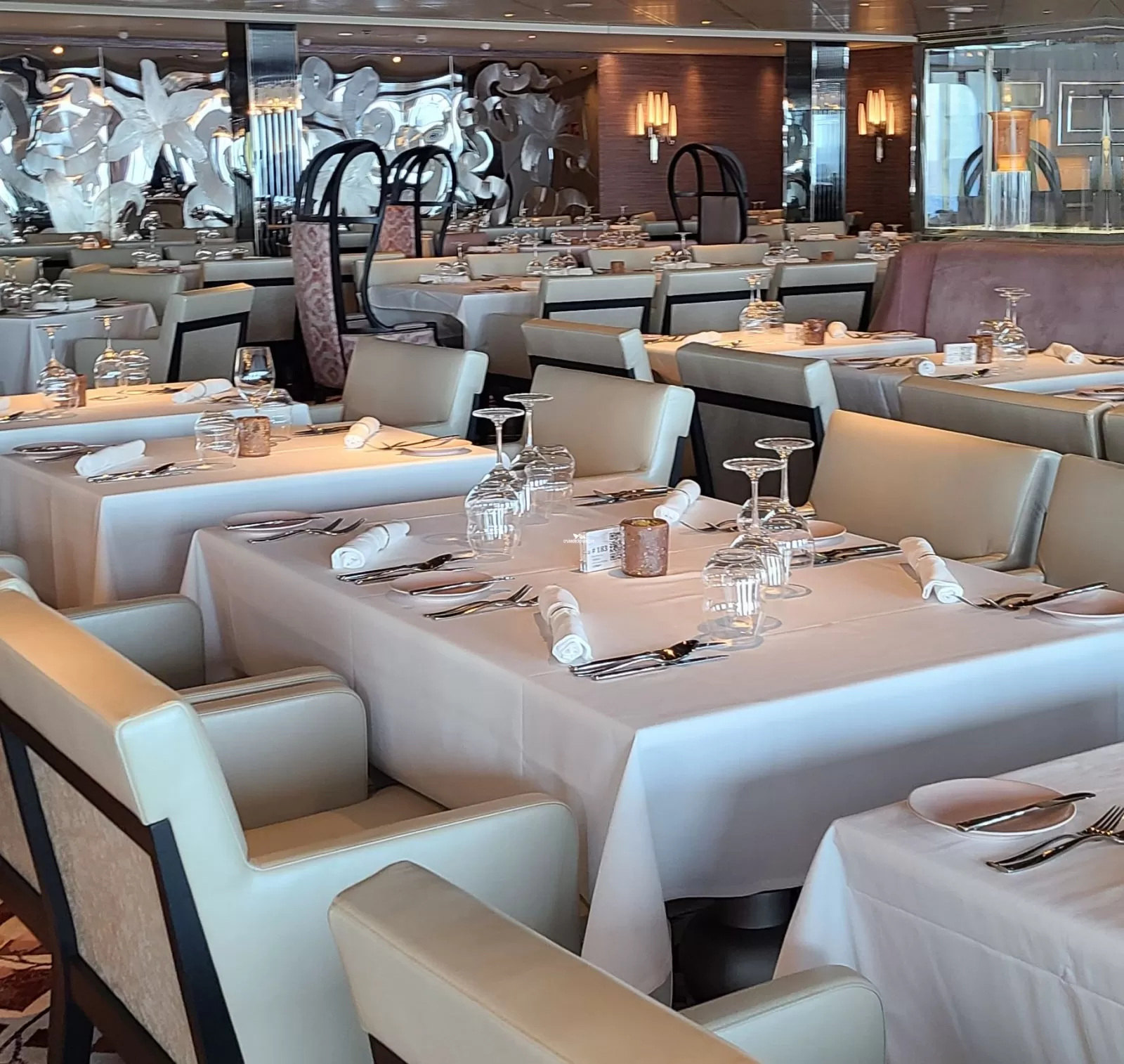 Contemporary French Dining, Seats 346 and serves dinner. Wooden panels from this former venue on the Celebrity Summit are incorporated into the design. French cuisine in a modern, upscale refined atmosphere to evoke the romance of springtime in Paris. Color palette similar to cherry blossoms in full bloom. Enjoy regional European wines, unique cocktails, and tantalizing appetizers.