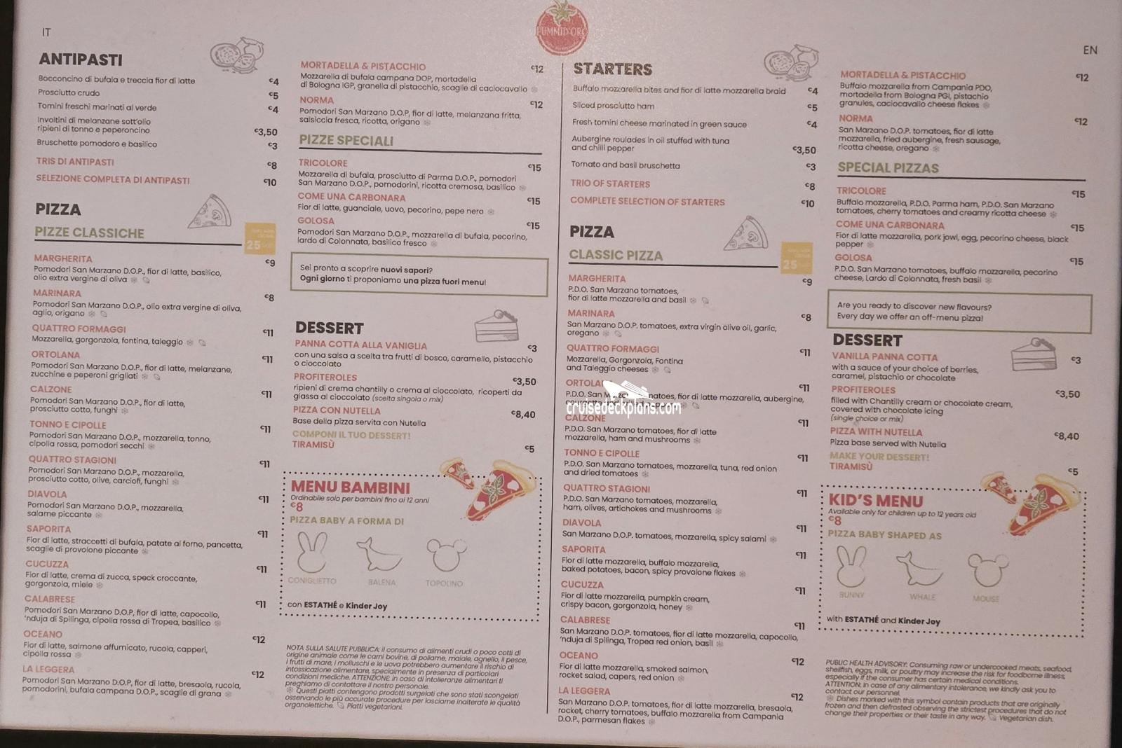 This page shows actual pictures for Costa Smeralda Pizzeria. Most of our pictures are contributed by actual cruisers. You will find that all the Costa Smeralda Pizzeria pictures on this page are also posted directly onto our deck plans near the actual location the photo was taken. You can browse the pictures here or you can click on them as you are viewing the Costa Smeralda deck plans. For deck plan viewing click on the ship button above or scroll down to view the pictures on this page.