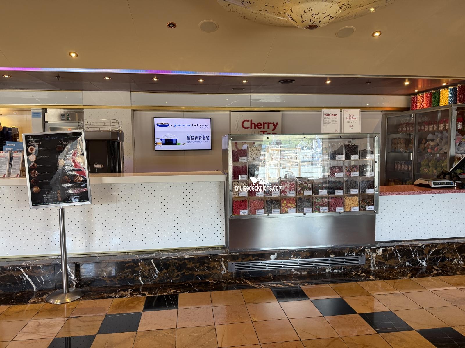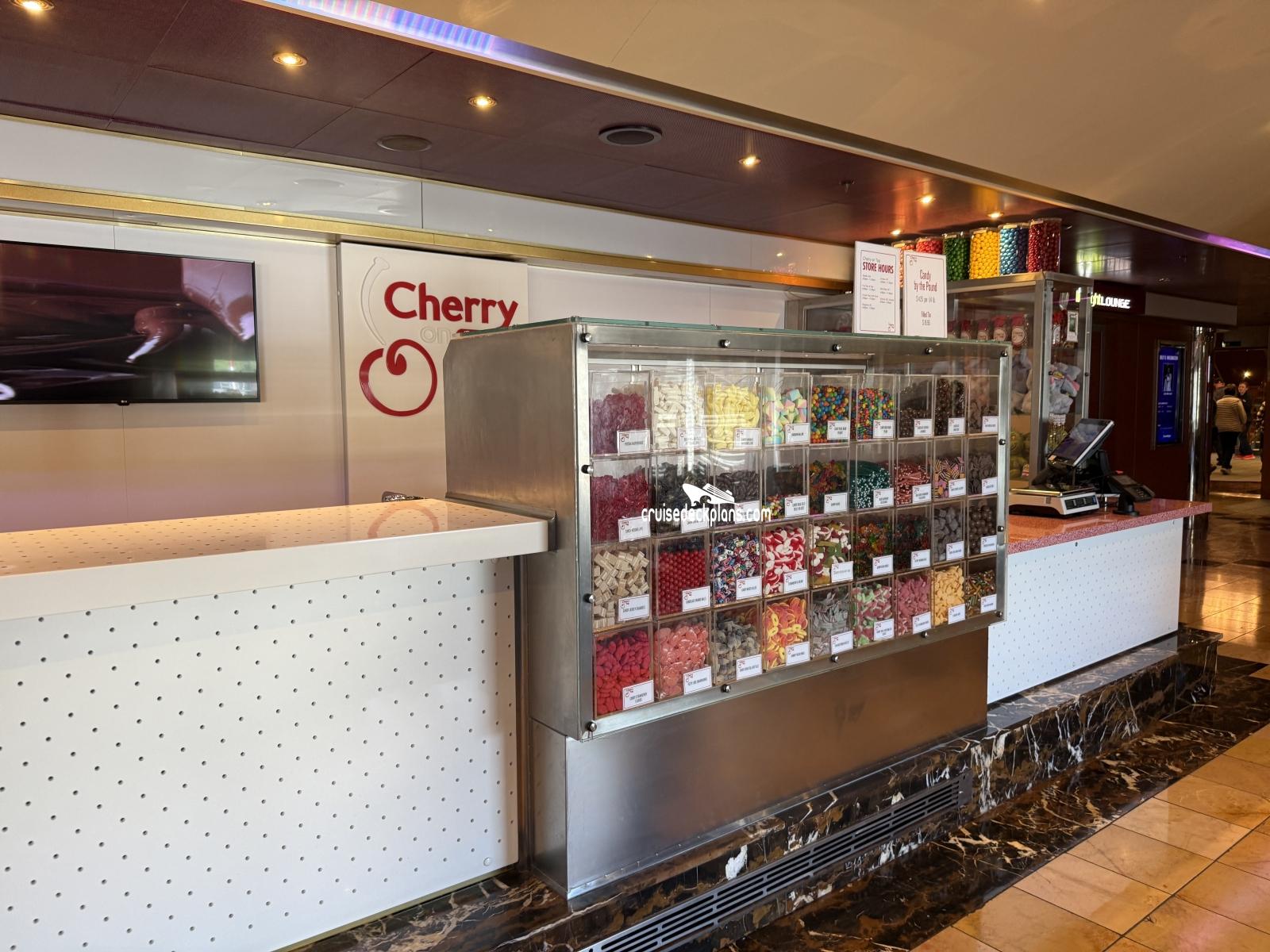Candy and Celebrations Shop. Bulk candies, confections and flowers ($). Cherry on Top logo apparel for Ladies and kids ($). Stateroom decoration packages ($).