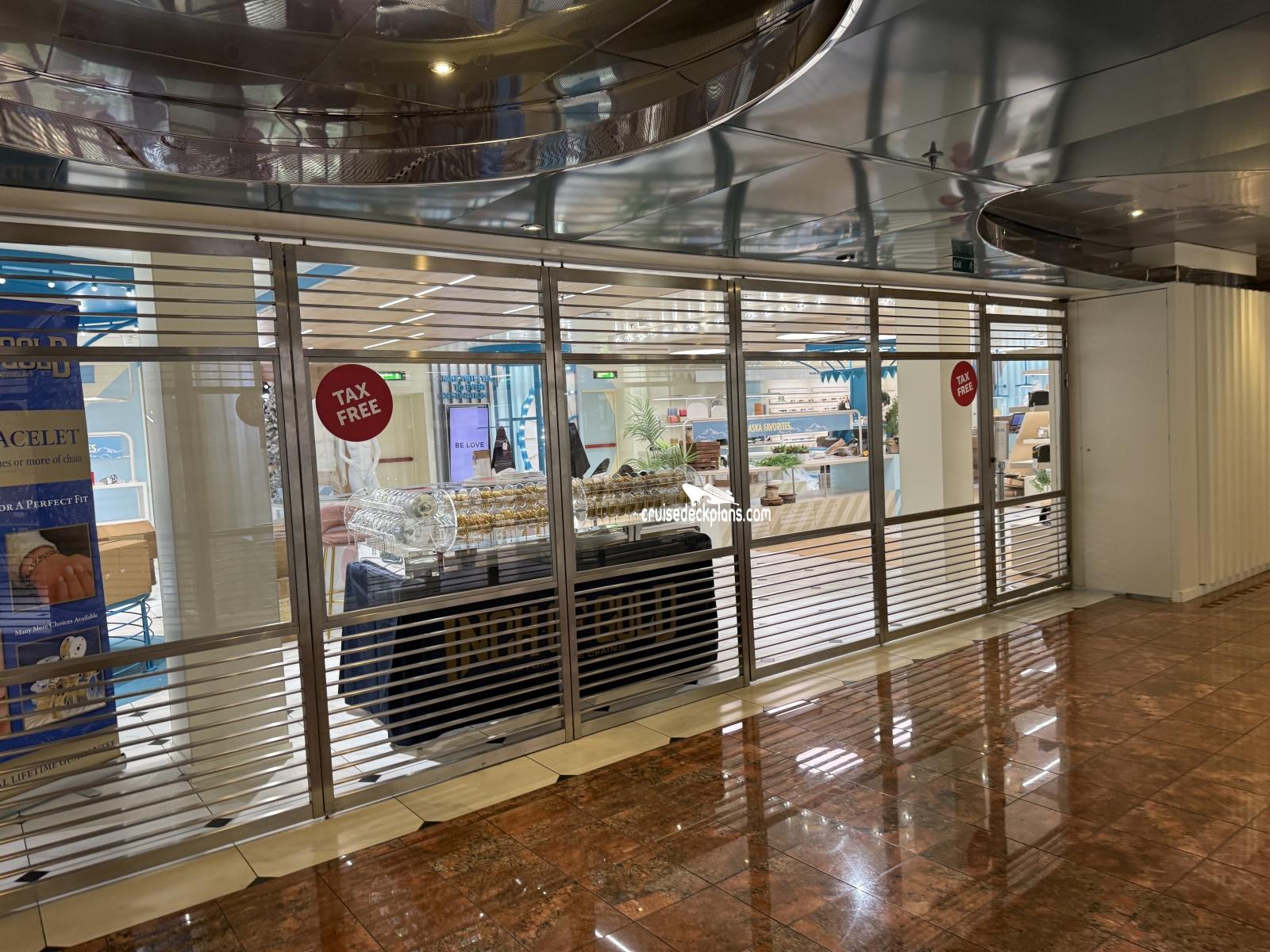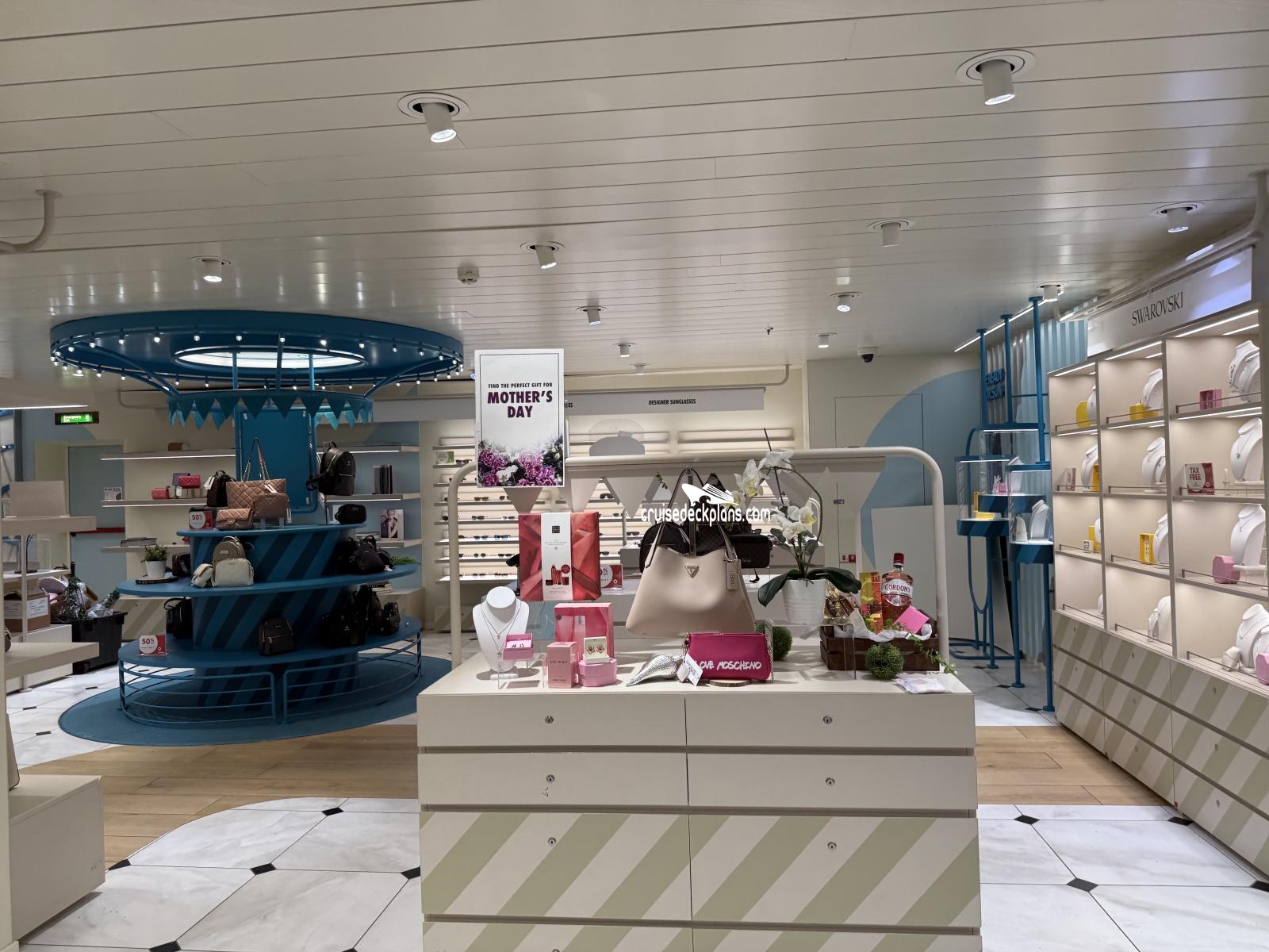 Shops featuring accessories, apparel, beauty and perfume, fine jewelry and watches, liquor and tobacco, gifts and sundries and Carnival logo items ($).