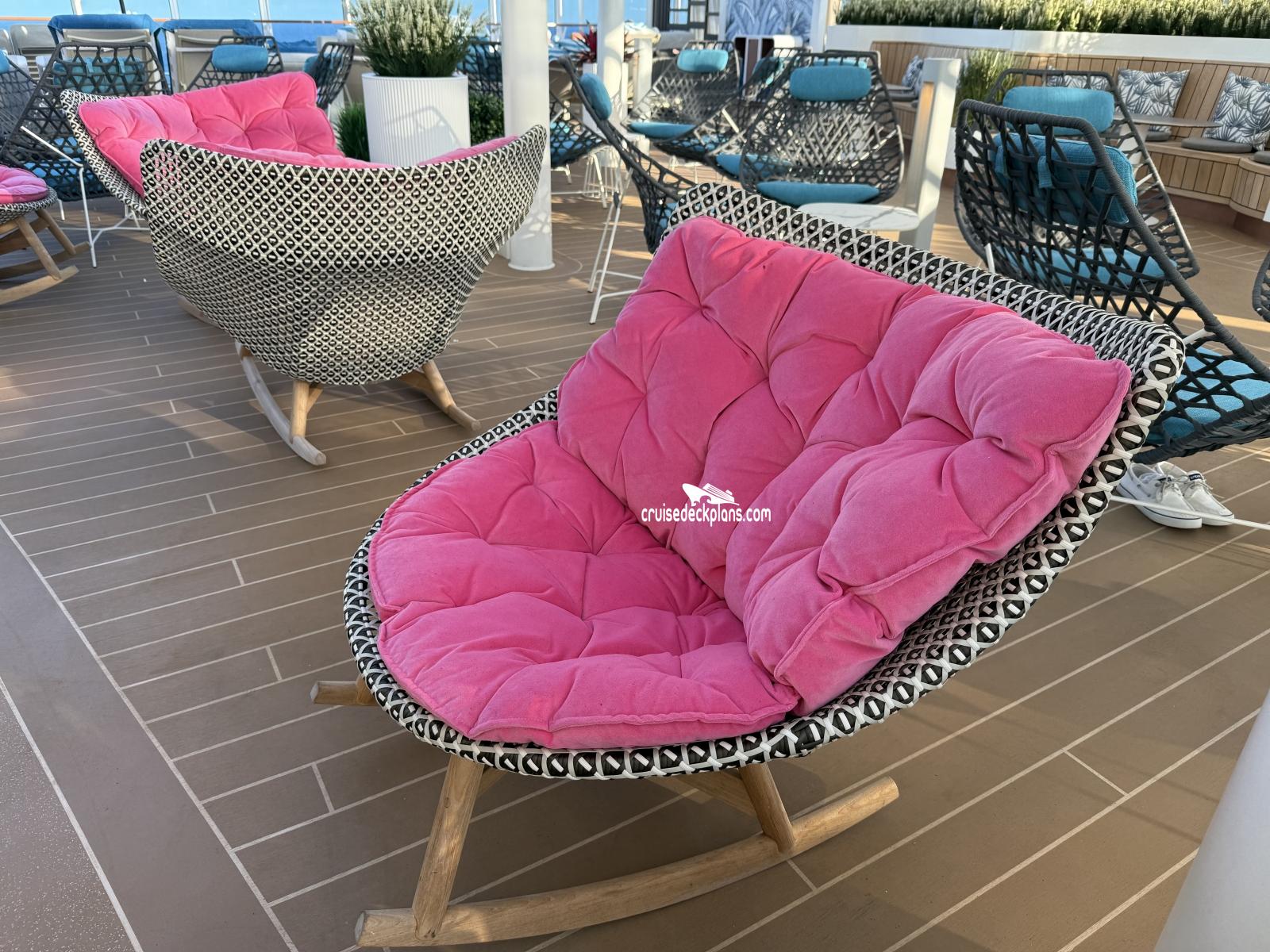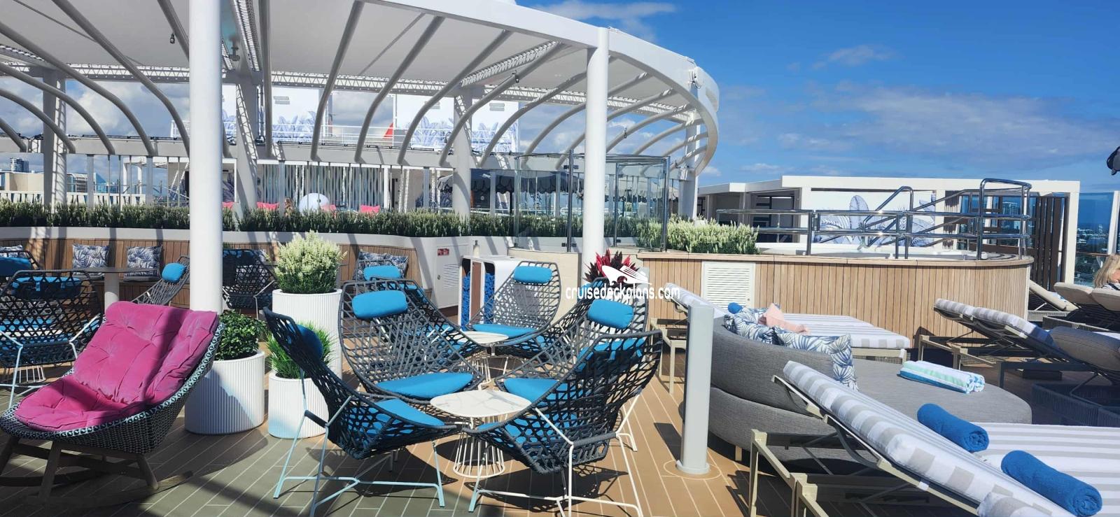Adult area (age 16 and over) with loungers for exclusive use by staterooms with Sanctuary Collection benefits. Fresh water pool, hot tubs, sun beds and dedicated bar. 177 loungers available FIRST COME FIRST SERVE. Limited shade. Also offers 8 cabanas for extra fee.