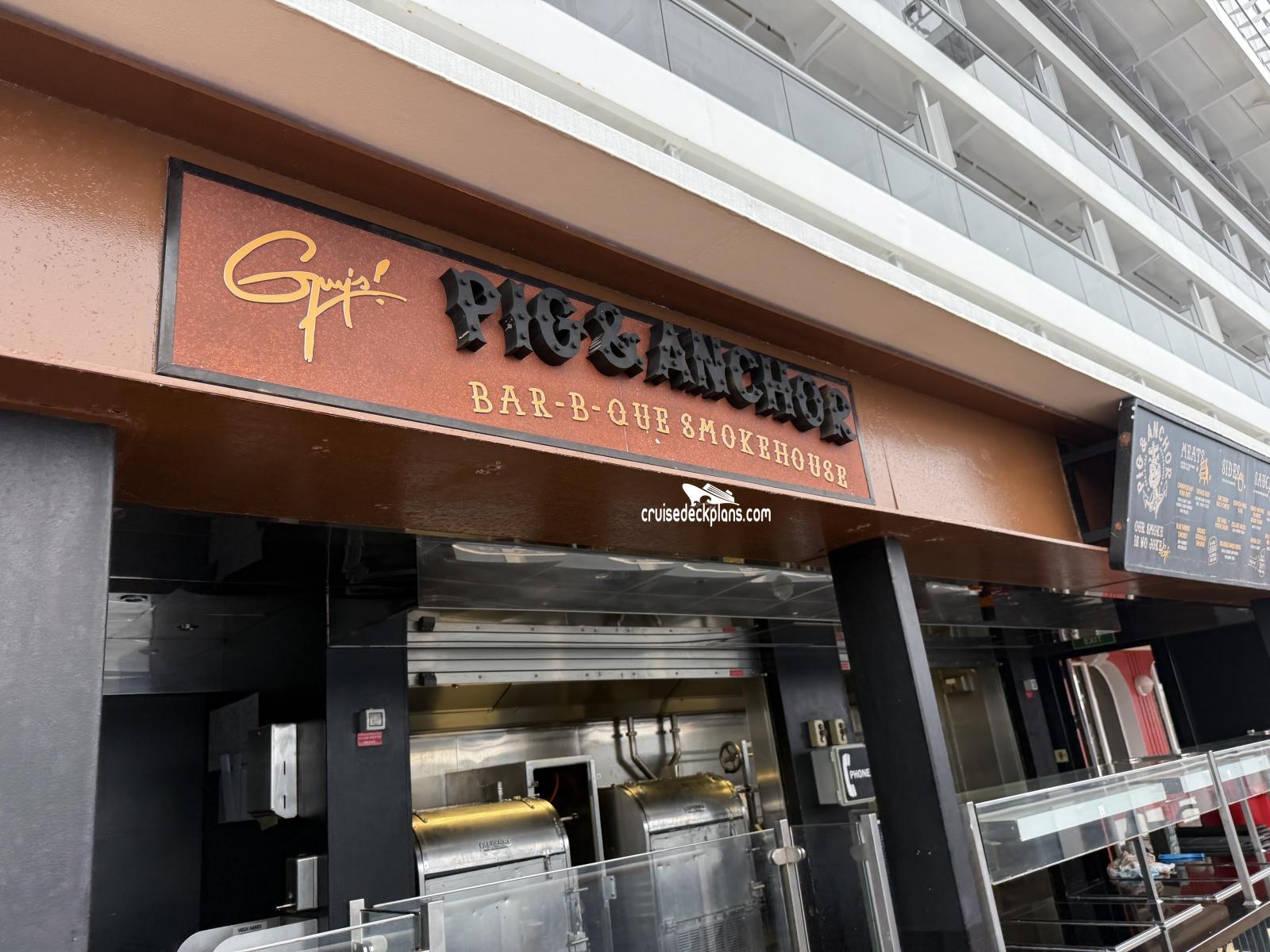 Hours: 12:00pm-2:30pm on sea days. Complimentary. Guys Pig & Anchor Bar-b-que Smokehouse. Includes menu items such as Championship Pork Butt, Smoked Andouille Sausage, and Guys famous Blue Ribbon Chicken; as well as sides like Mac Daddy Mac 'n Cheese and Old Skool Potato Salad. Top it all off with Guys line of signature barbecue sauces.