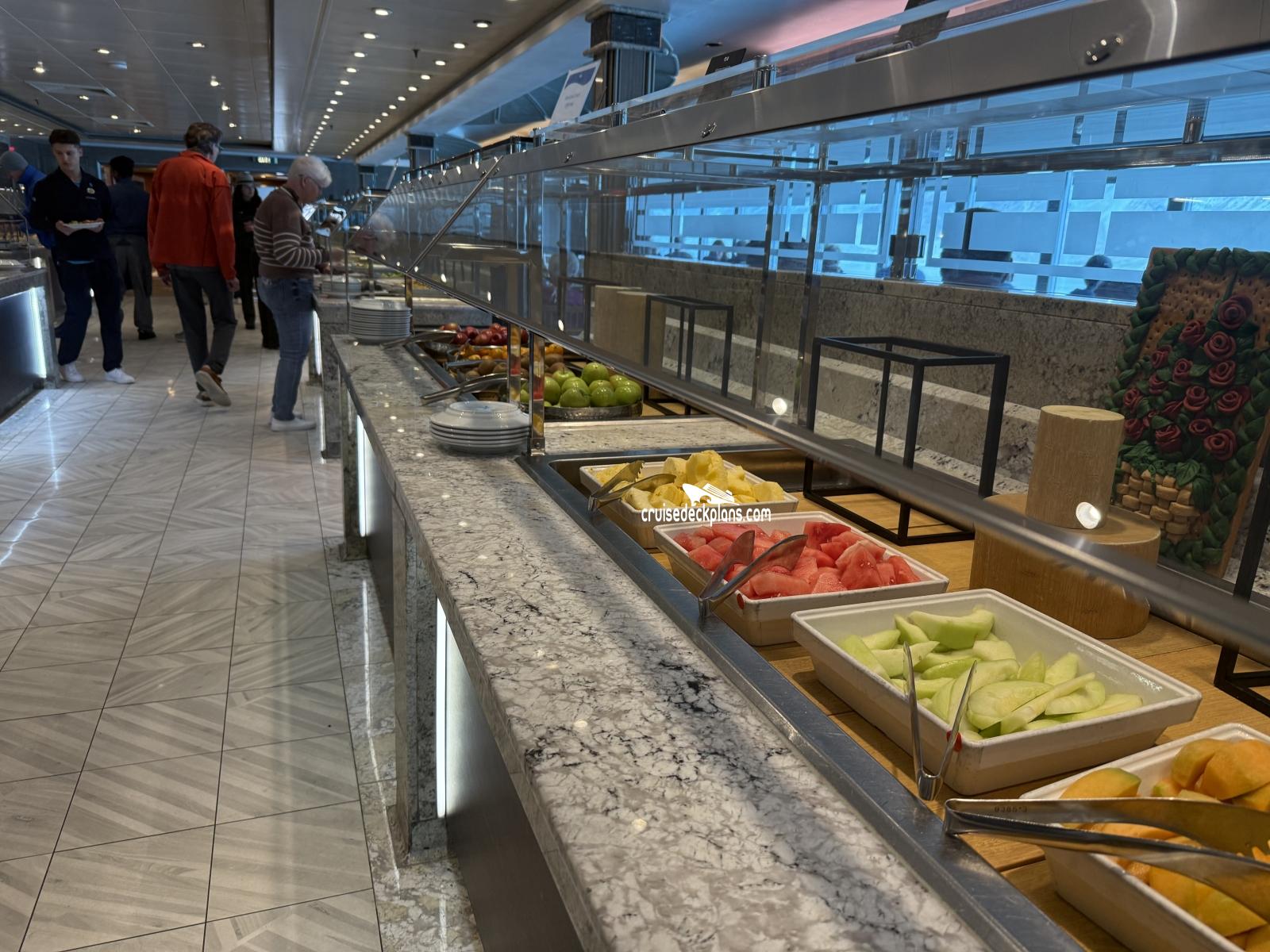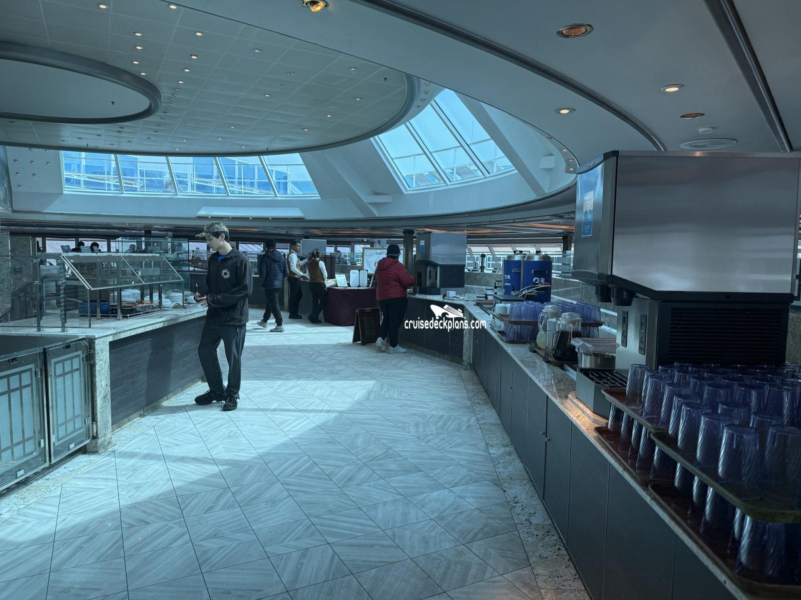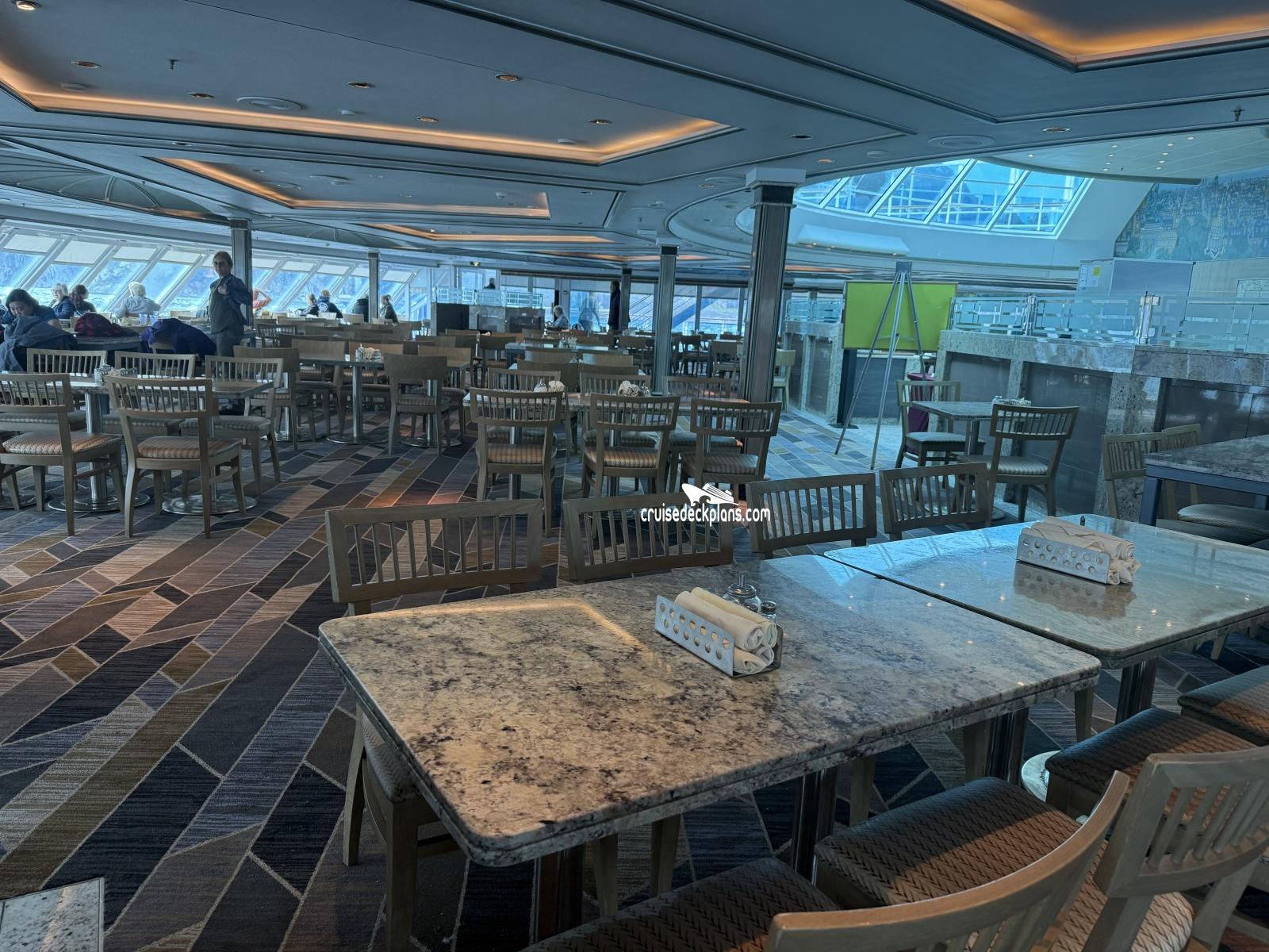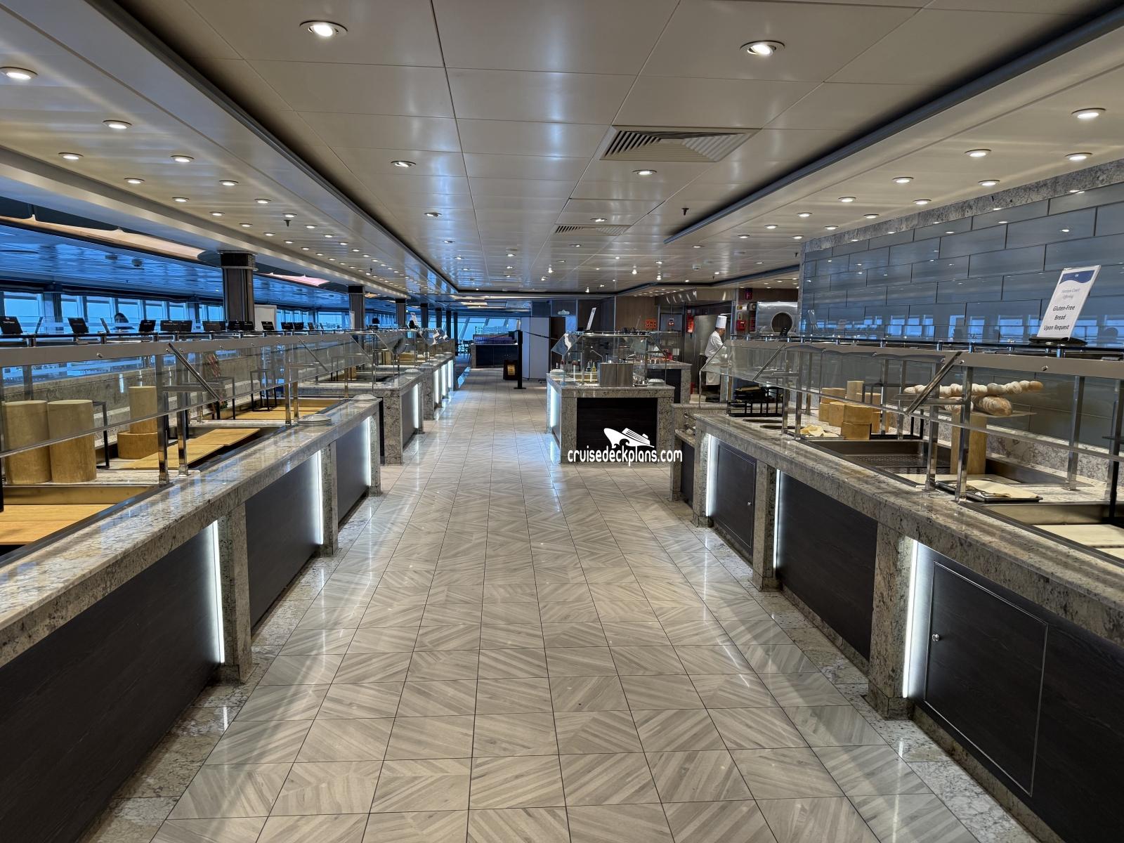 The ship's buffet style restaurant serving breakfast, lunch, dinner, and snacks.