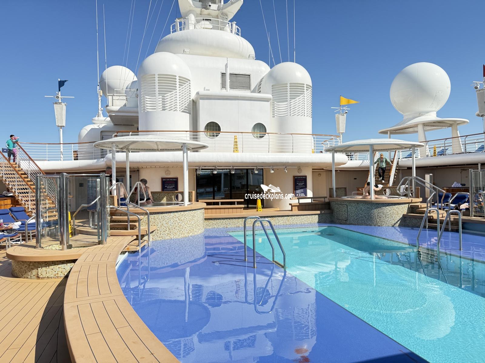 The pool is designed for guests 18 years of age and older with a maximum depth of 4 feet and includes 2 whirlpool spas and around 40 teak deck lounge chairs with plush cushions.