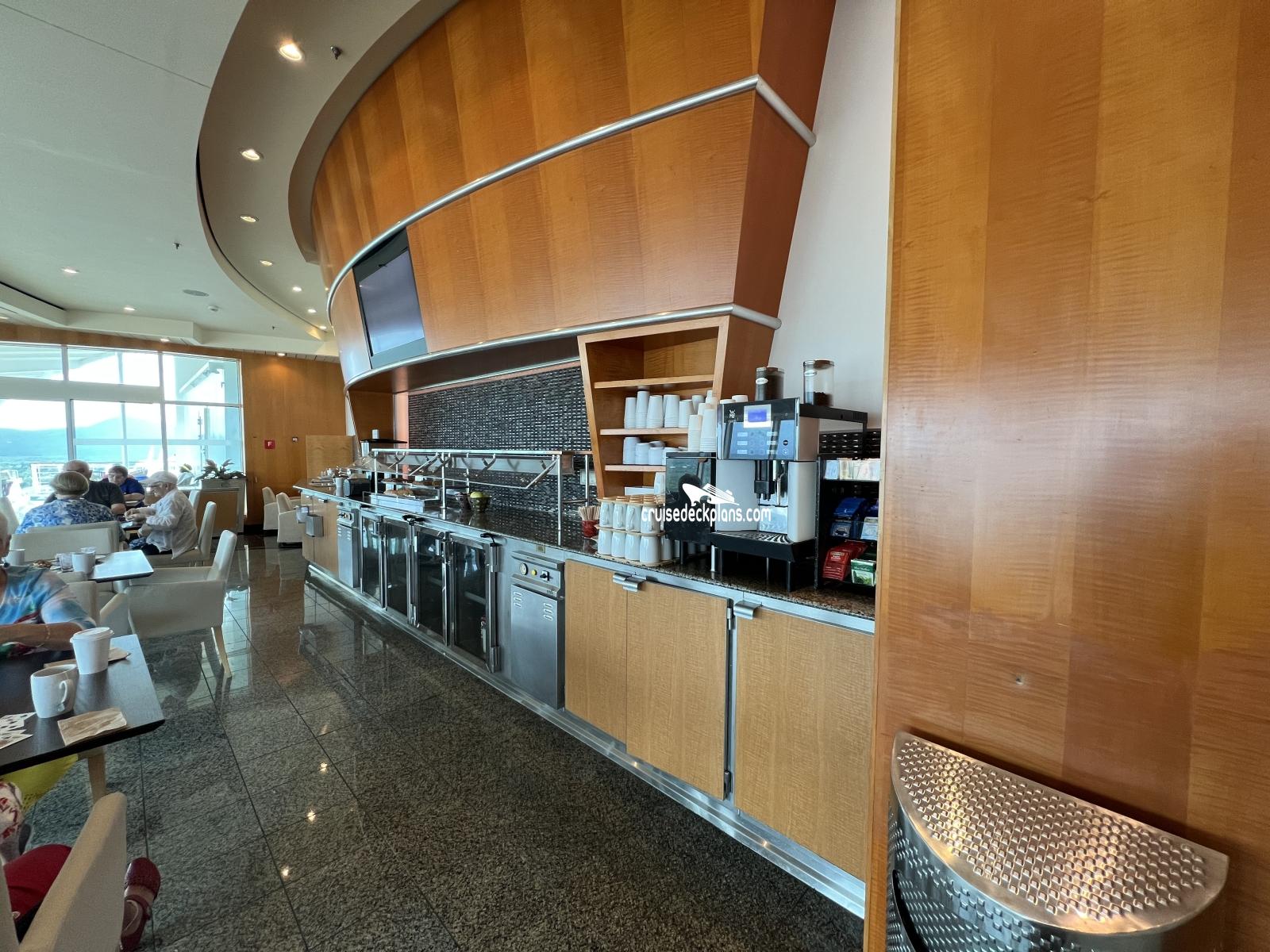 seats 32 guests and is for Diamond, Diamond Plus, and Pinnacle Club Crown & Anchor® Society members. It features concierge access, complimentary continental breakfast, and evening drinks. A self-service coffee and hot chocolate machine is also available in the Diamond Lounge.