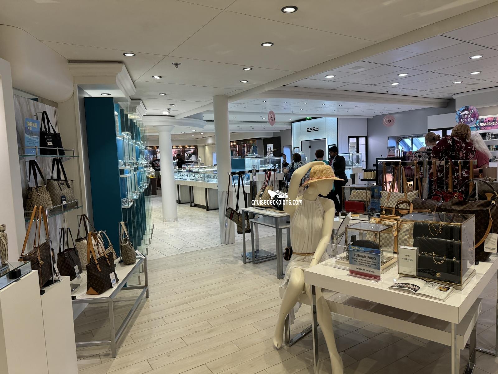 They are a selection of shops and boutiques selling duty free items including jewelery, clothes, liquor and souvenirs.