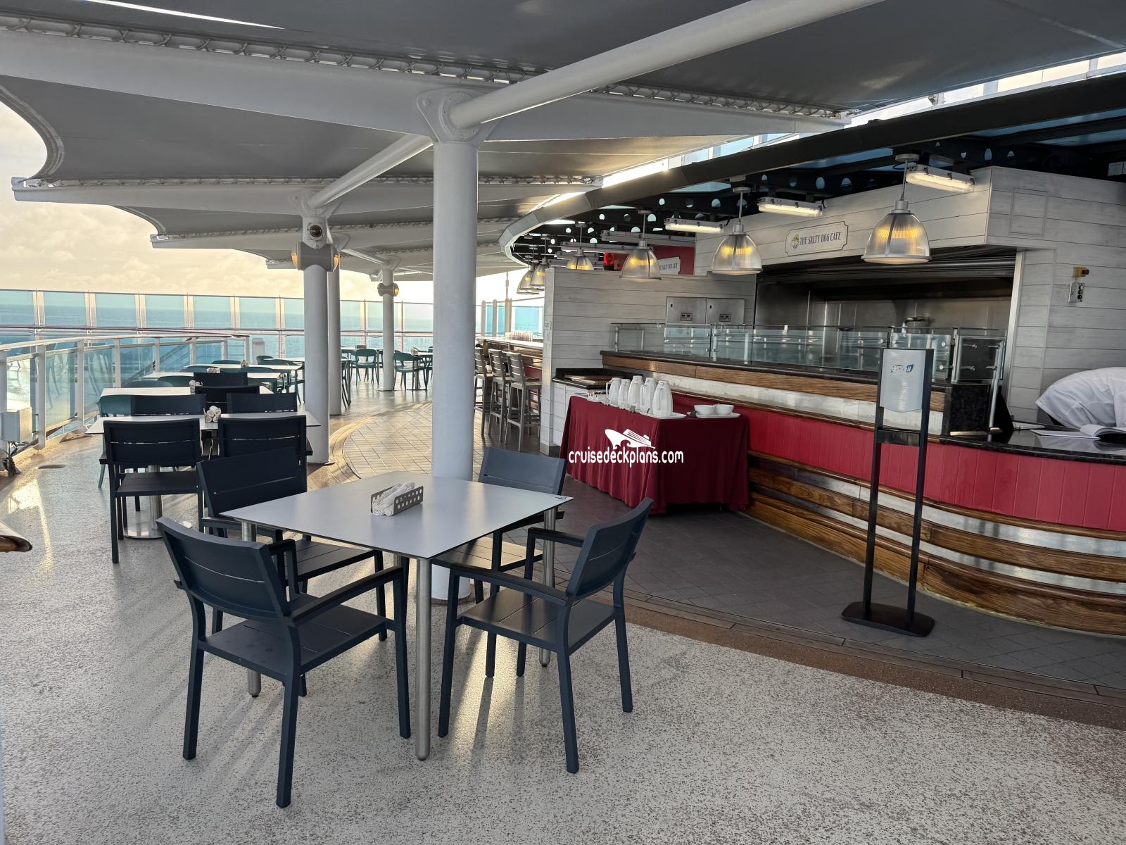 Serves the outdoor Sun Deck of the ship with refreshments and food.