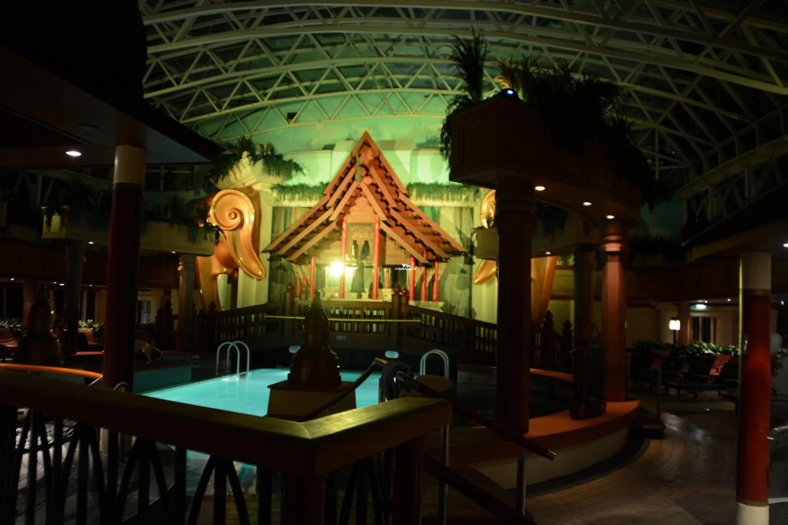Decorated in a Thai theme with bronze tigers and an 18th Century Temple Bell, wooden deck chairs with chaise pads surround the pool. With cascading waterfalls and protected from inclement weather by the retractable glass roof, it's the perfect place for adults to enjoy a refreshing swim in the heated pool or relax in the whirlpool.
