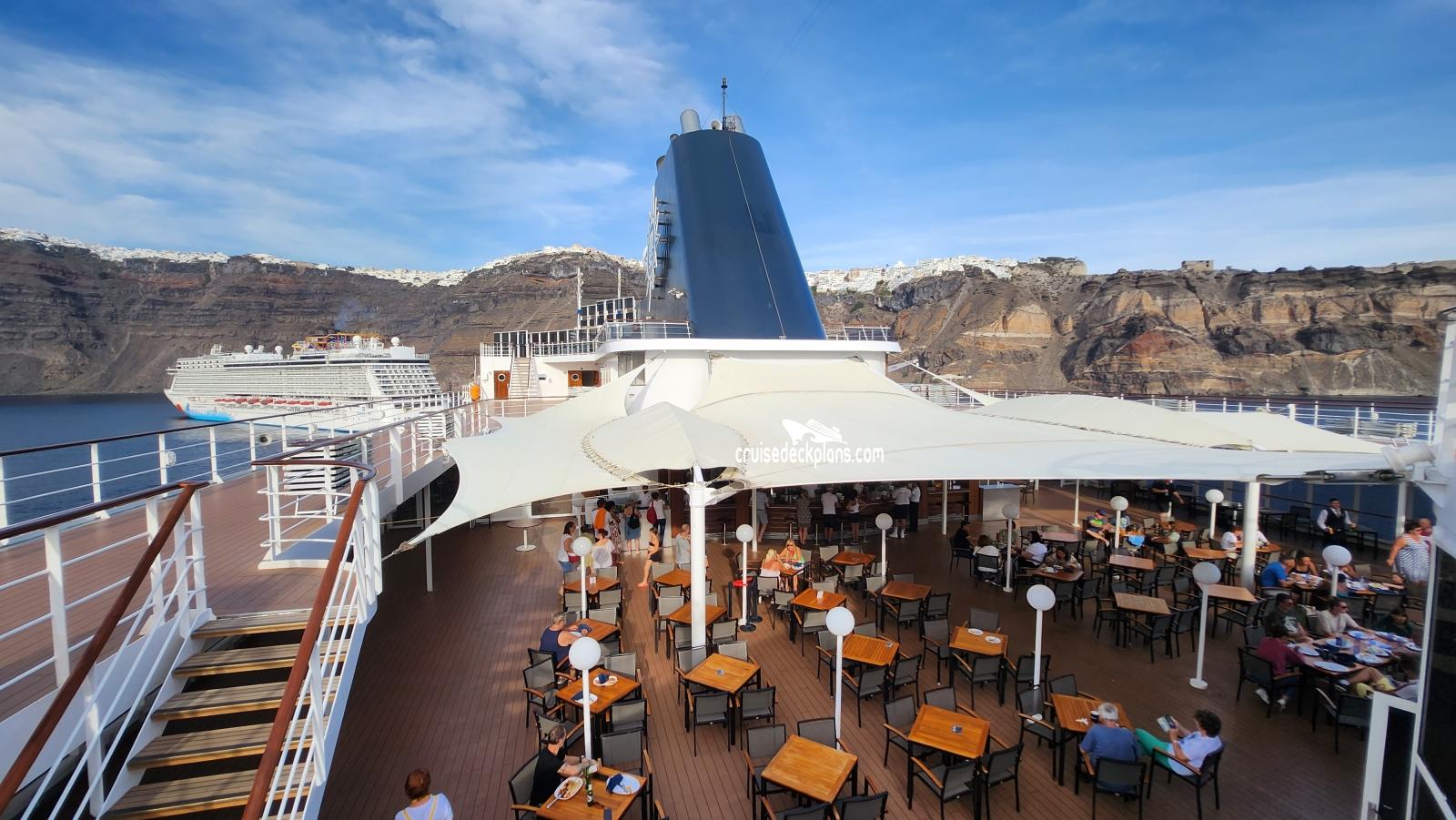 It is the ship's alfresco dining area where guests can sit with food from the main buffet or enjoy a snack from the outdoor pizzeria and pasta station or grill station serving burgers, chicken, hotdogs, salad, fries and a changing daily option. Seats 404 guests.