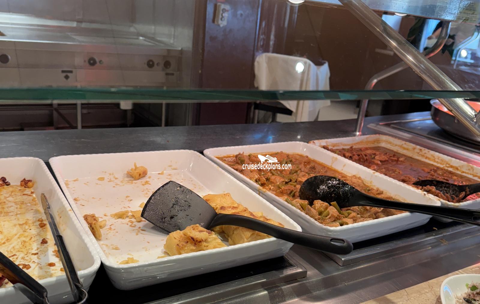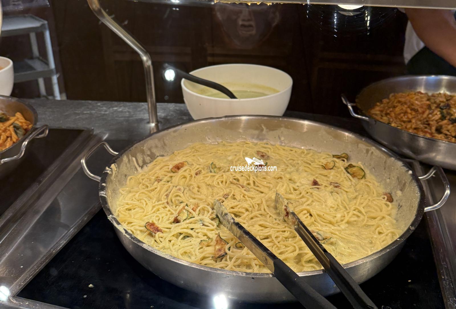 The ship's self service complimentary buffet spans almost half the length of deck 14. It seats 412 guests in the Zanzibar section and 404 guests in the L'Africana area, and is open non-stop for 20 hours each day from 6am to 2am with tea, coffee and tap water available 24 hours (in the Zanzibar section, starboard).