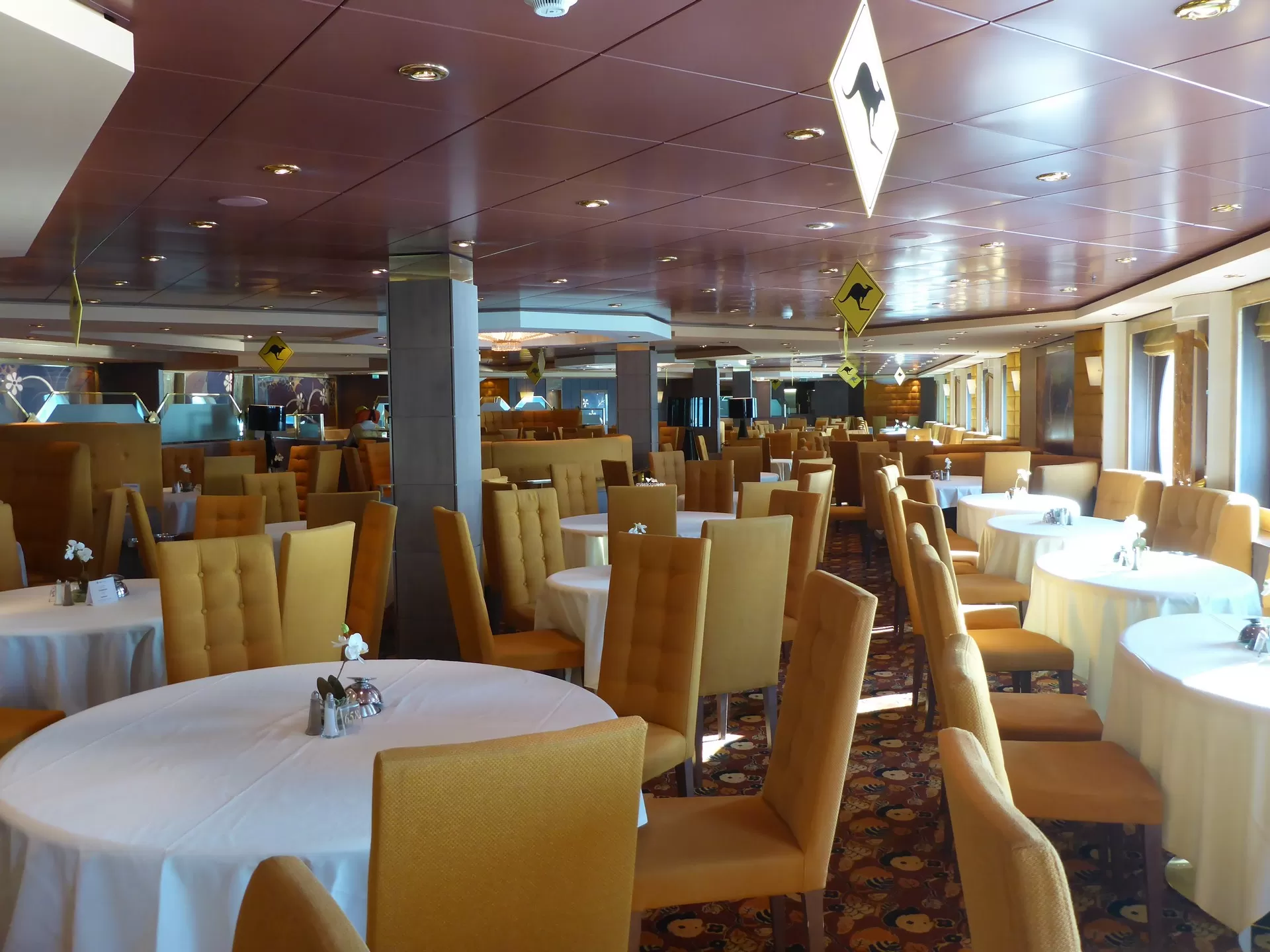 The ship's lower main dining room accommodating 720 guests. The restaurant opens for breakfast and lunch (both of which are open seating) and fixed seating dinner where guests are allocated fixed either early or late seating.