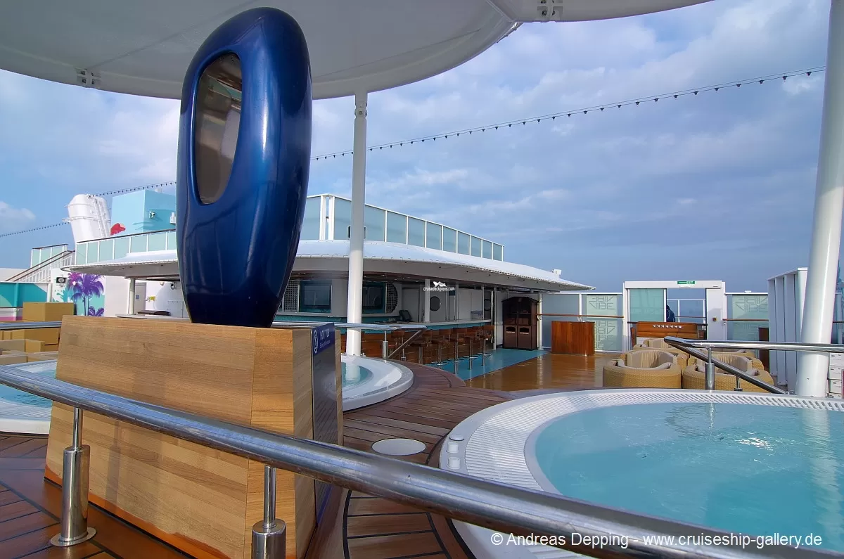 One of the ship's two over 18 only venues and features an over sized hot tub, luxurious chaise lounge and a relaxing water feature. The Beach Club also has its own full liquor bar, refreshing fruit skewers, water spritzers and chilled towels. To access the facilities guests must purchase an access pass which are limited in number and cost around $20 per person per day or $79 per person for a week long pass.