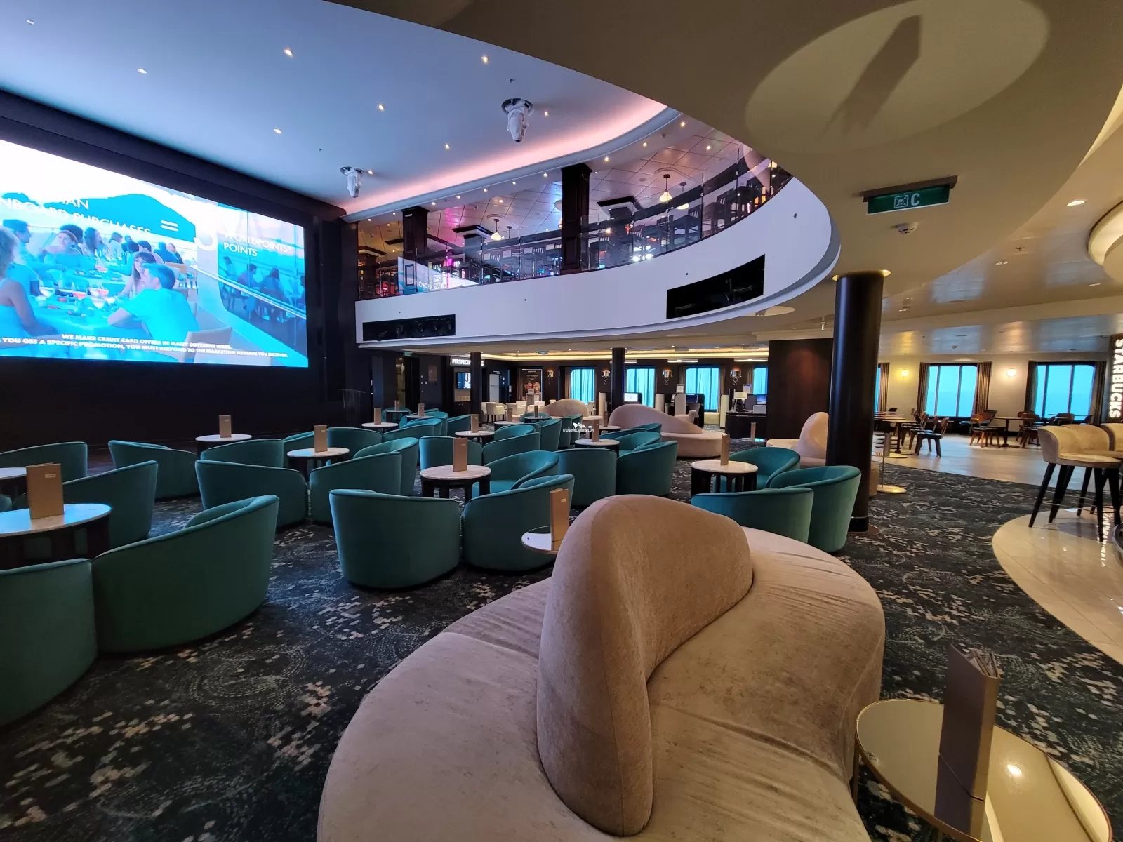Three deck high atrium with its large open seating area at the base of the atrium on deck 6 and a giant screen used for airing live sporting events, movies and open Nintendo Wii gaming.