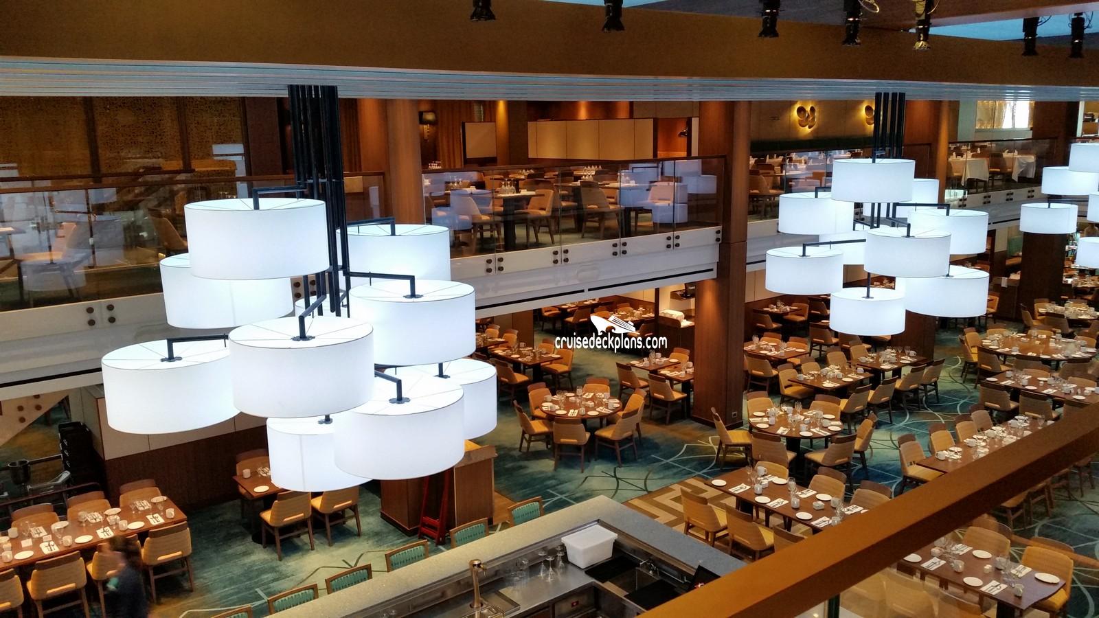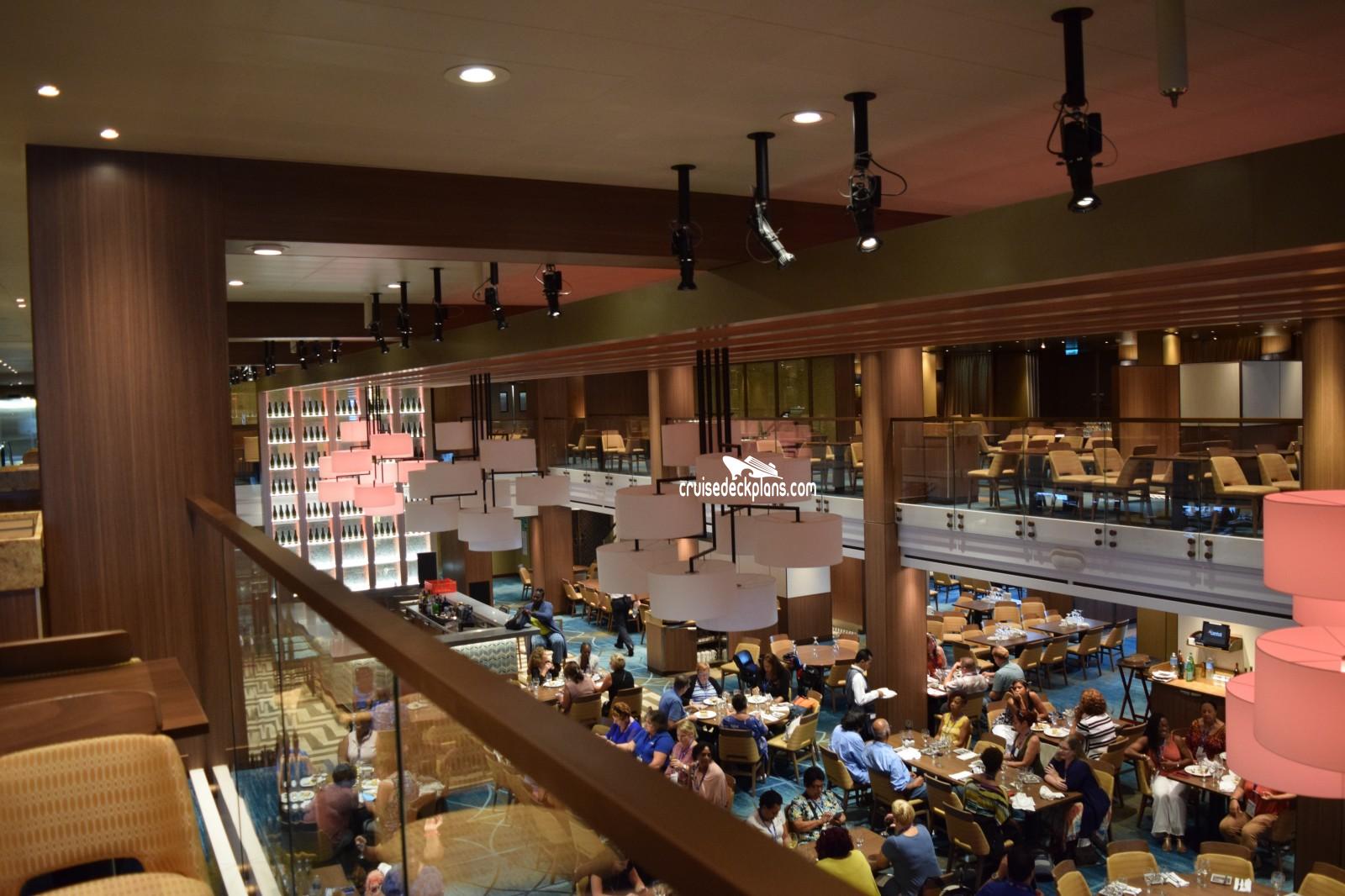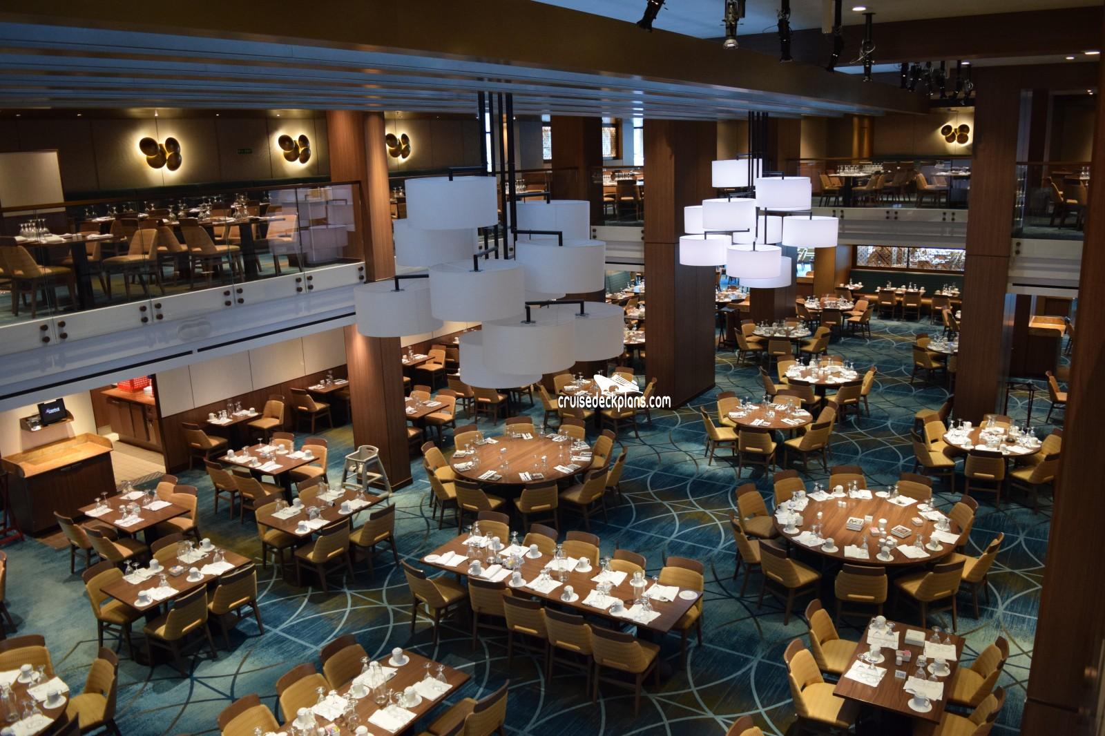 The ships main restaurant located in the aft of deck 3 and deck 4. Two levels. Offers sit-down waiter service. There is also a sit-down bar near the entrance for guests waiting to be seated. Open nightly for open dining at 5:45 p.m.